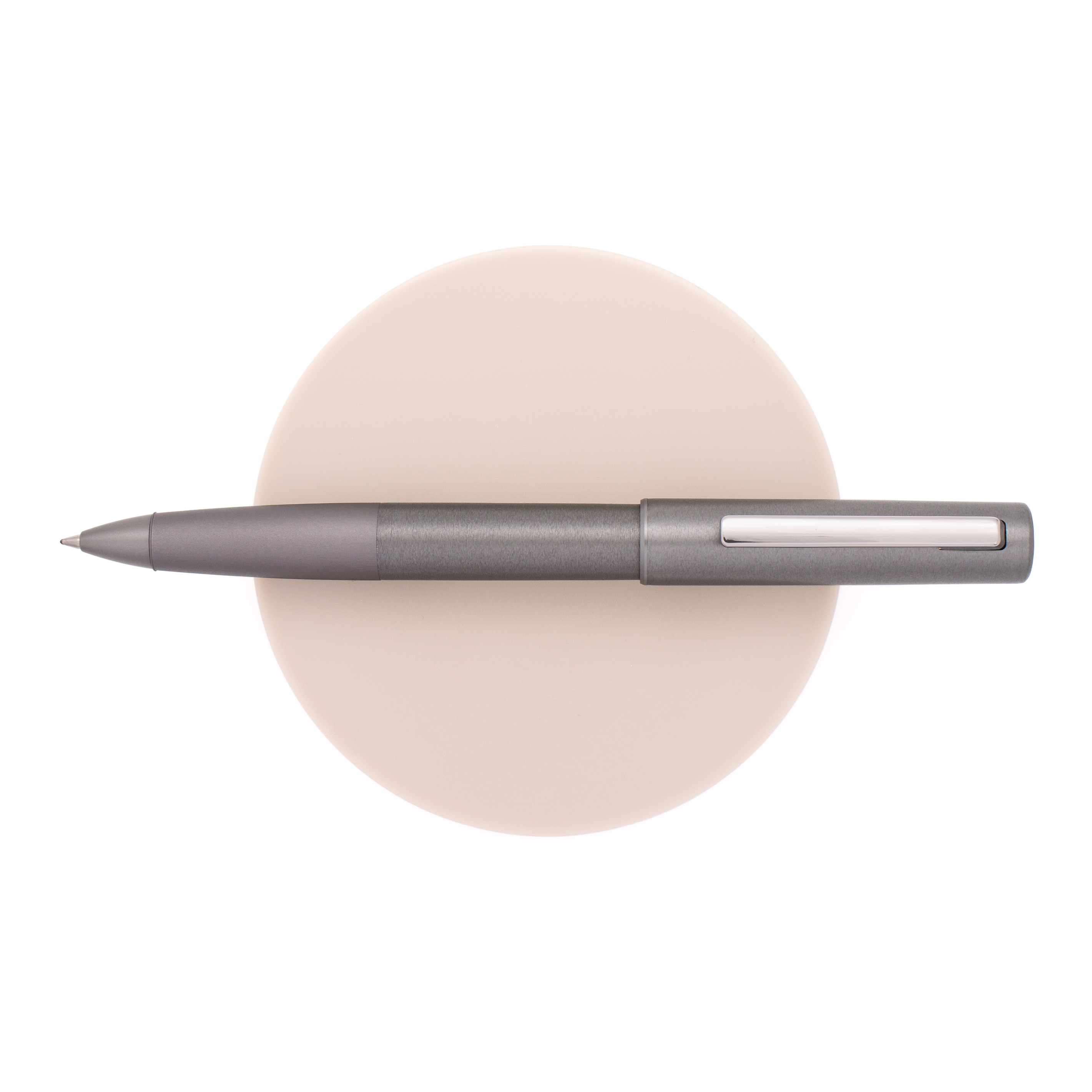 Rollerball pen in graphite anodized aluminum with brushed steel clip. Smooth, fluid writing and modern design by Jasper Morrison. Compatible with LAMY M63 refills.