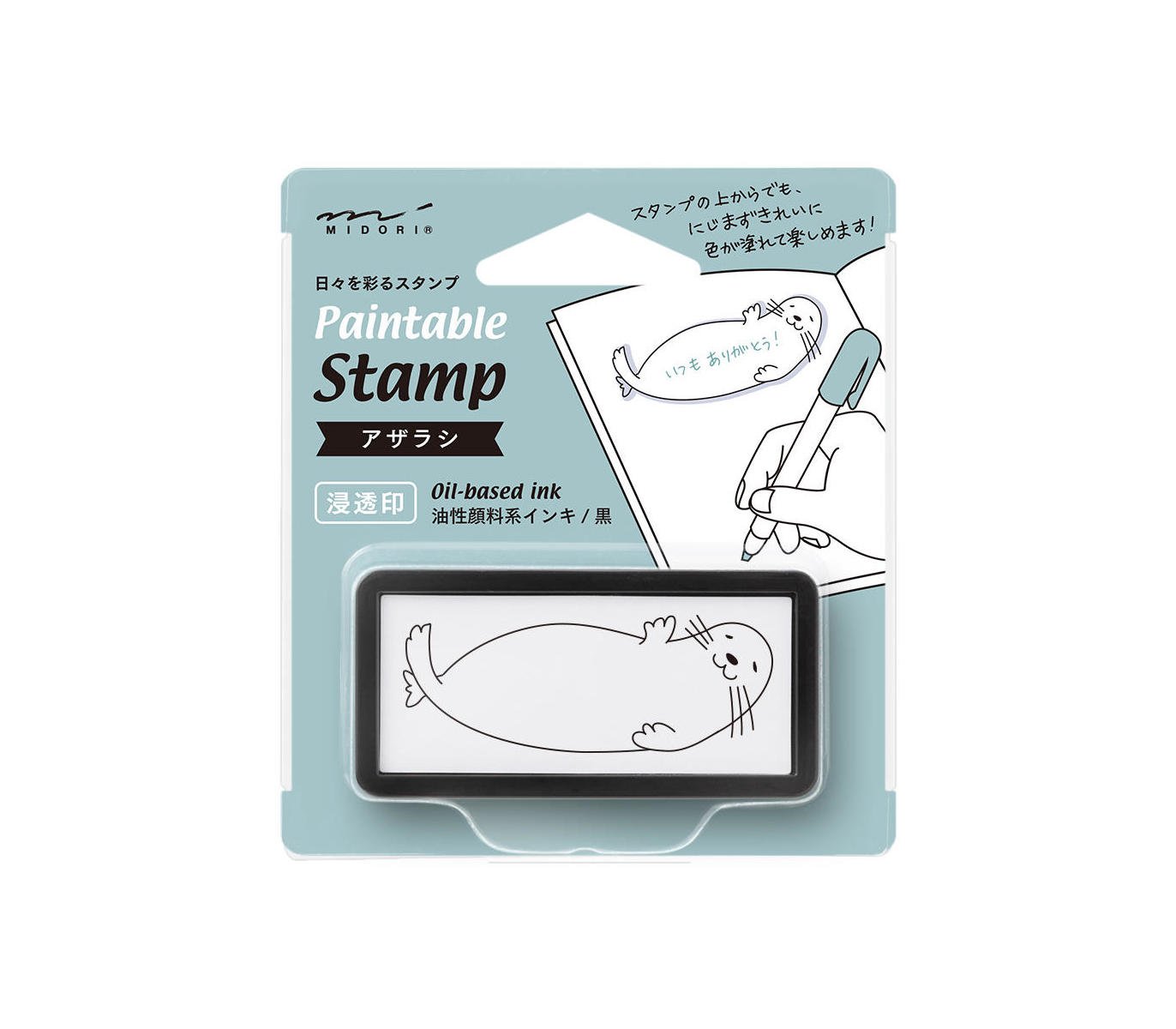 Stamp, write and decorate your notebook, diary or message cards with Midori Paintable Stamp Pre-Inked Half-Size Seal. It can be stamped without using a stamp stand and written over with water-based markers and pens.