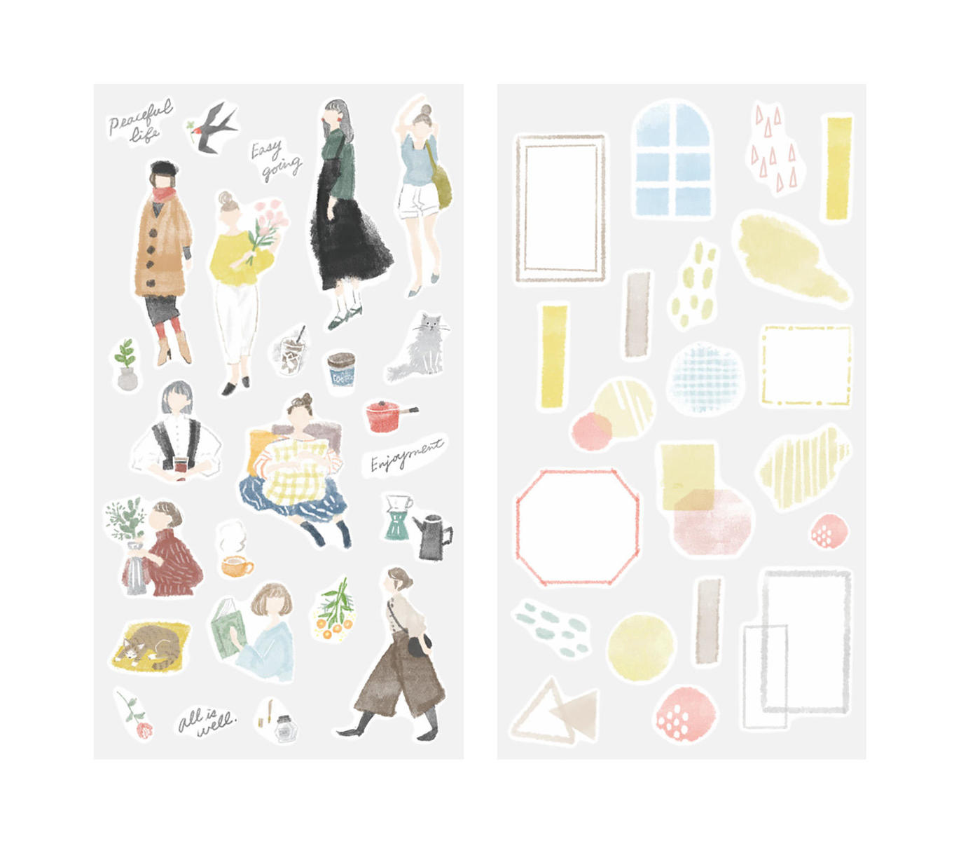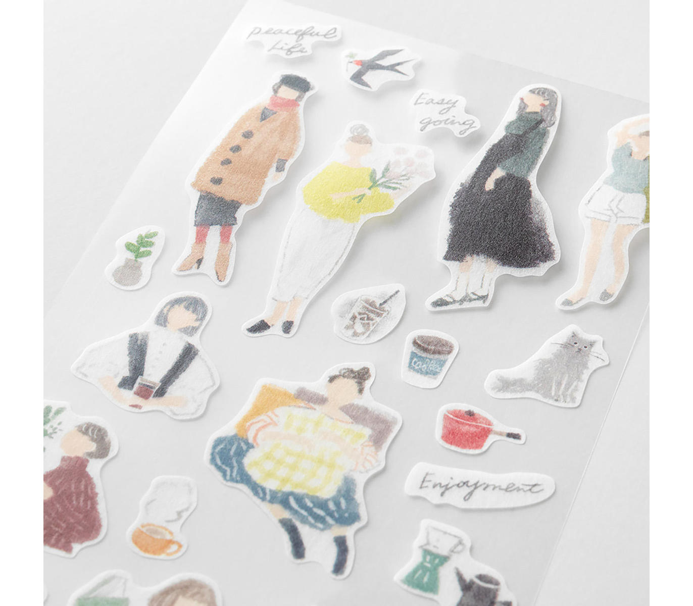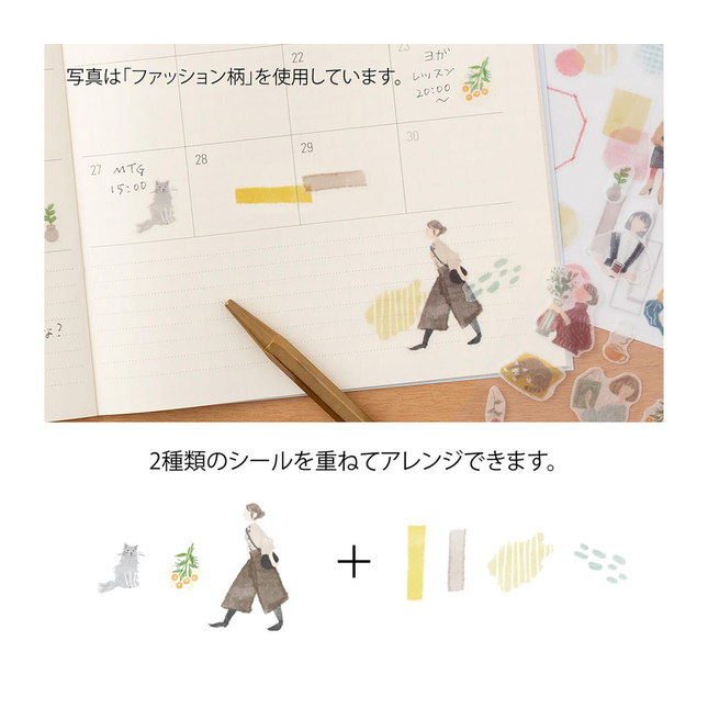 Midori Sticker Two Sheets Fashion features casual to slightly formal women expressed with watercolor touch. A sticker made of masking tape for decorating notebooks and diaries, planners. The set contains two sheets of stickers that can be combined to create your own design. The translucent sticker can be applied on top of each other to create even more fun designs.