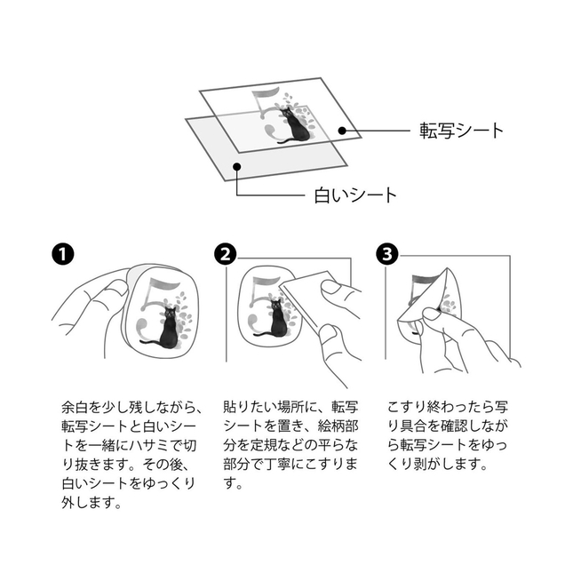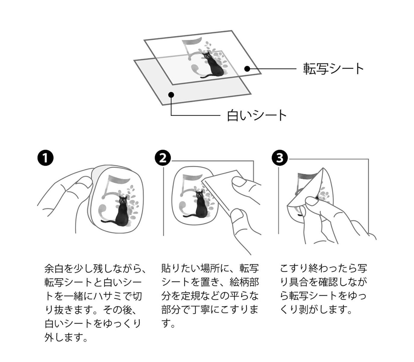 Keeping the transfer sheet and the white sheet together, cut out the section you wish to use with scissors, then slowly remove the white sheet. Place the transfer sheet on the area you wish to stick the pattern, and rub the pattern with the flat surface of a ruler or a similar object. Apply pressure lightly and evenly to ensure that the pattern transfers correctly. After rubbing, carefully peel off the transfer sheet while checking the image quality. Attempting to remove the entire sheet at once may cause part of the pattern to cut off or to remain stuck to the film.