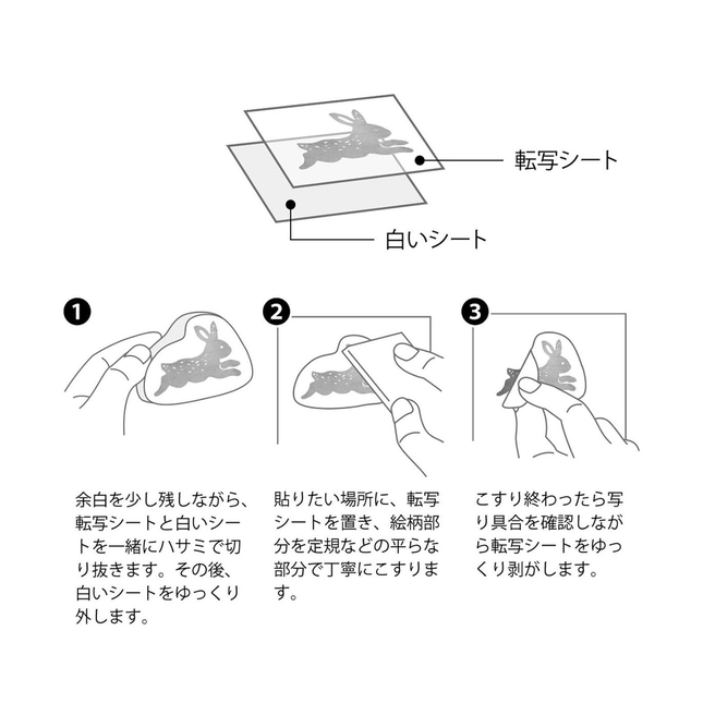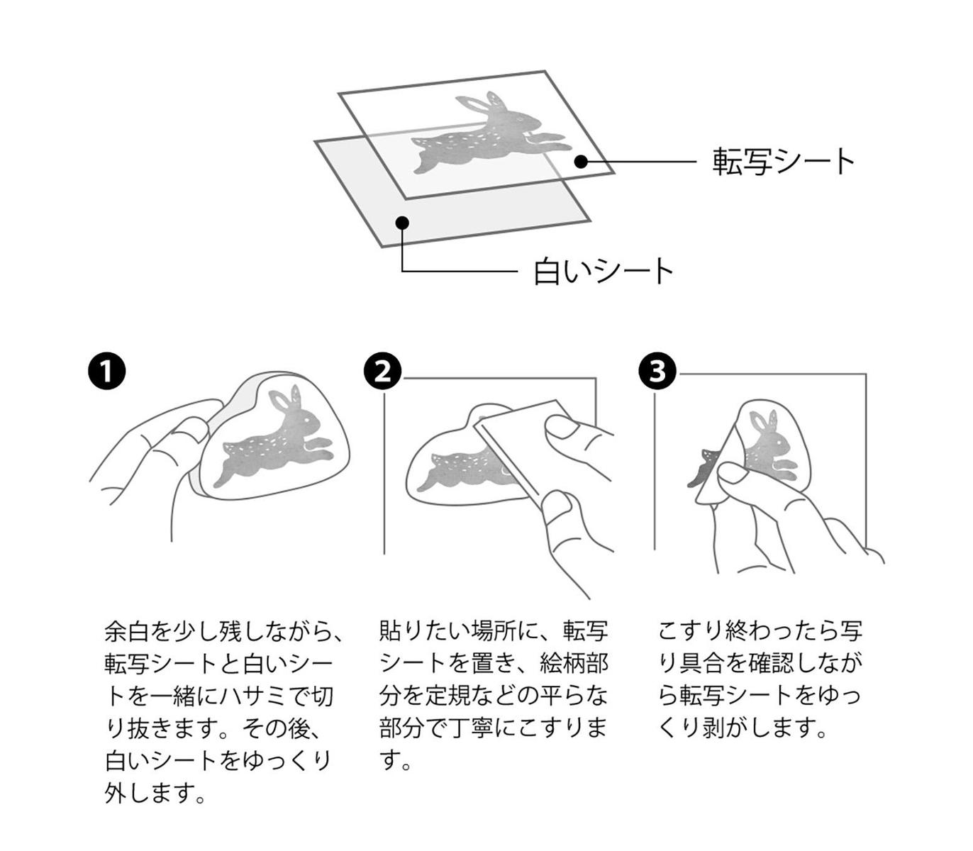 Keeping the transfer sheet and the white sheet together, cut out the section you wish to use with scissors, then slowly remove the white sheet. Place the transfer sheet on the area you wish to stick the pattern, and rub the pattern with the flat surface of a ruler or a similar object. Apply pressure lightly and evenly to ensure that the pattern transfers correctly. After rubbing, carefully peel off the transfer sheet while checking the image quality. Attempting to remove the entire sheet at once may cause part of the pattern to cut off or to remain stuck to the film.