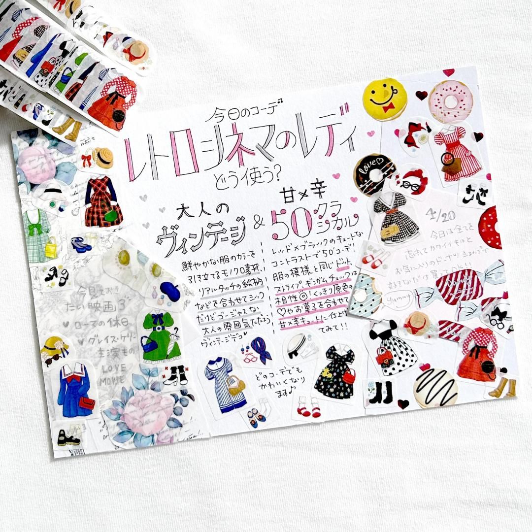 Washi tape with mix-and-match stickers inspired by retro cinema fashion. Create your own outfit of the day with elegant dresses and accessories.