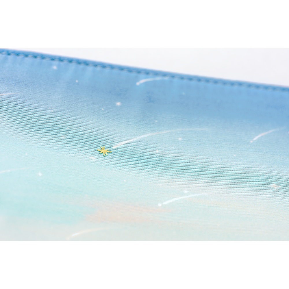 Un meteorite più grande brilla di lamina dorata, catturando la luce nel cielo. All’interno, il paesaggio continua con mare e cielo che si fondono in un orizzonte calmo. Il segnalibro grigio chiaro con riflesso delicato si integra con eleganza, mentre il portapenne consente di fissare la penna con la clip mantenendo la linea pulita della cover.
