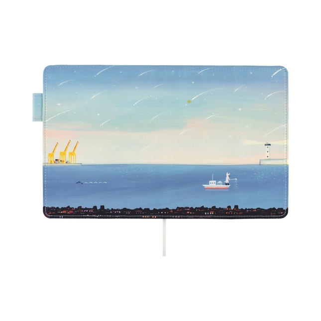 Copertina Hobonichi 5-Year Techo A6 firmata Hiroko Kubota. Un paesaggio onirico tra meteore dorate, pesci volanti e un gatto che regola il sale del mare. Poetica, surreale e piena di dettagli nascosti.