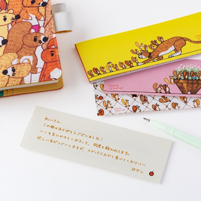 Hobonichi Letter Set – 100%ORANGE: Squirrel’s Moving Day ti permette di rivivere una scena indimenticabile del libro illustrato Ohikkoshi del duo artistico 100%ORANGE. Un allegro corteo di scoiattoli che camminano uno dietro l’altro: un’immagine semplice ma capace di trasmettere freschezza e gioia.