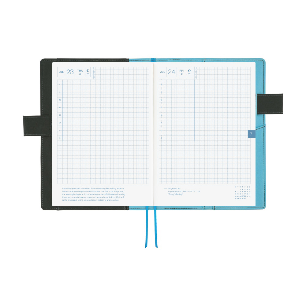 L’interno abbina un elegante nero inchiostro a un azzurro cielo che ricorda la serenità di una giornata limpida. Un segnalibro sottile in blu vivido aggiunge un accento brillante anche a cover chiusa.