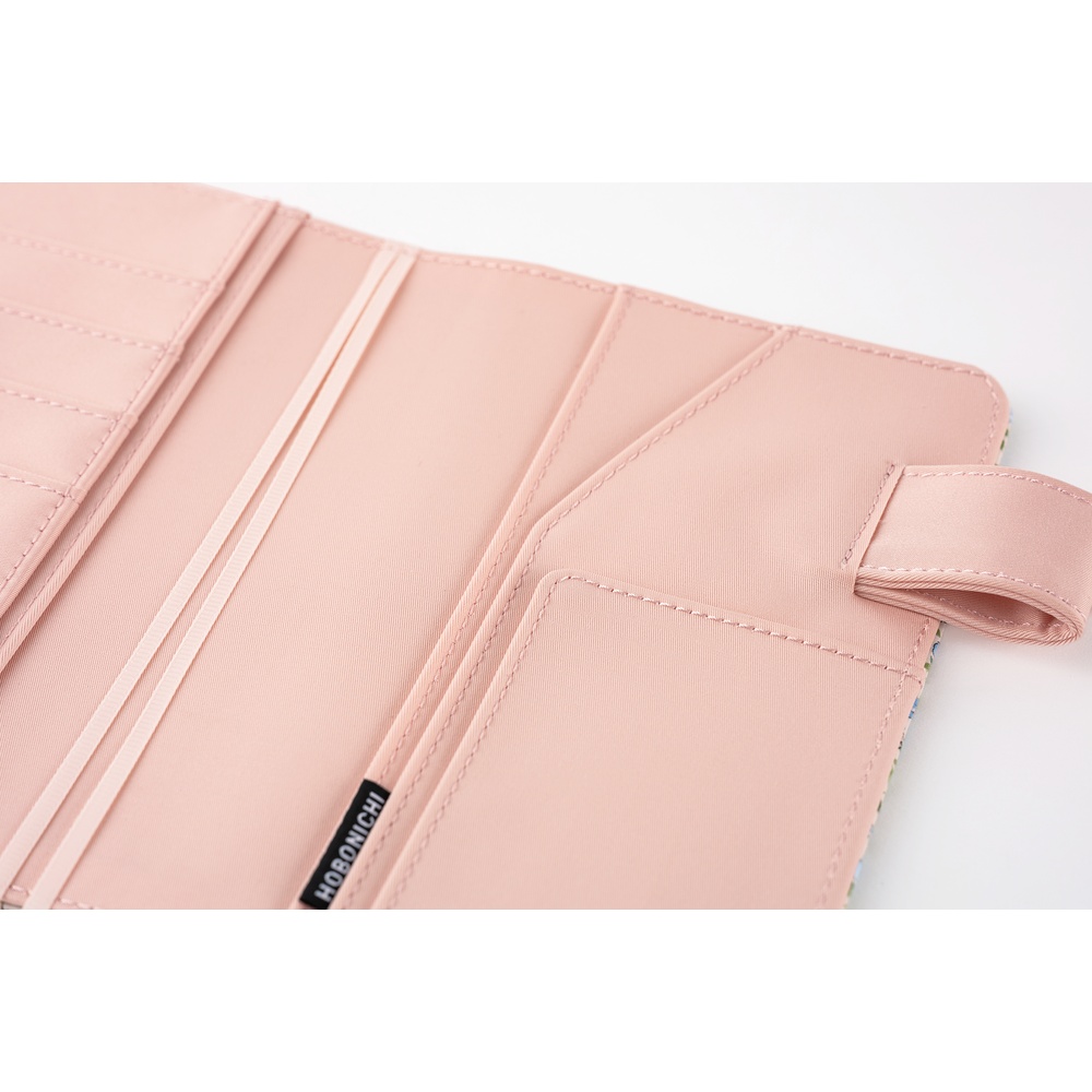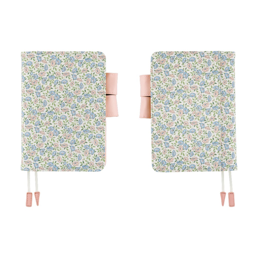 Copertina Hobonichi A6 Liberty Fabrics Sasha Kiora in cotone, con delicato motivo floreale rosa e azzurro. Interni rosa chiaro e dettagli raffinati per un design elegante e poetico.