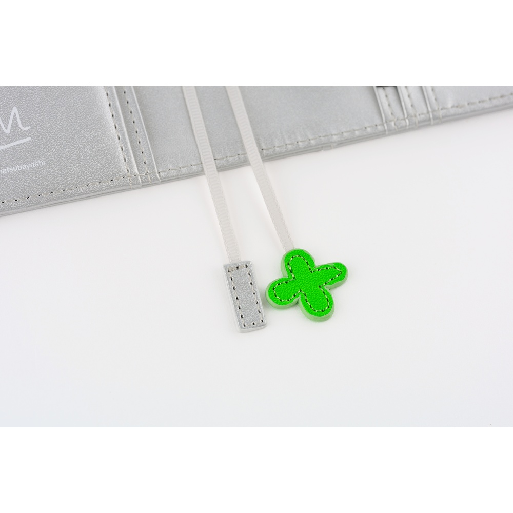 I due segnalibri sono arricchiti da charm speciali: uno dei due, disegnato dallo stesso Matsubayashi, è dedicato a un fiore, realizzato in verde fluorescente per aggiungere un contrasto vivace all’eleganza argentea della copertina.