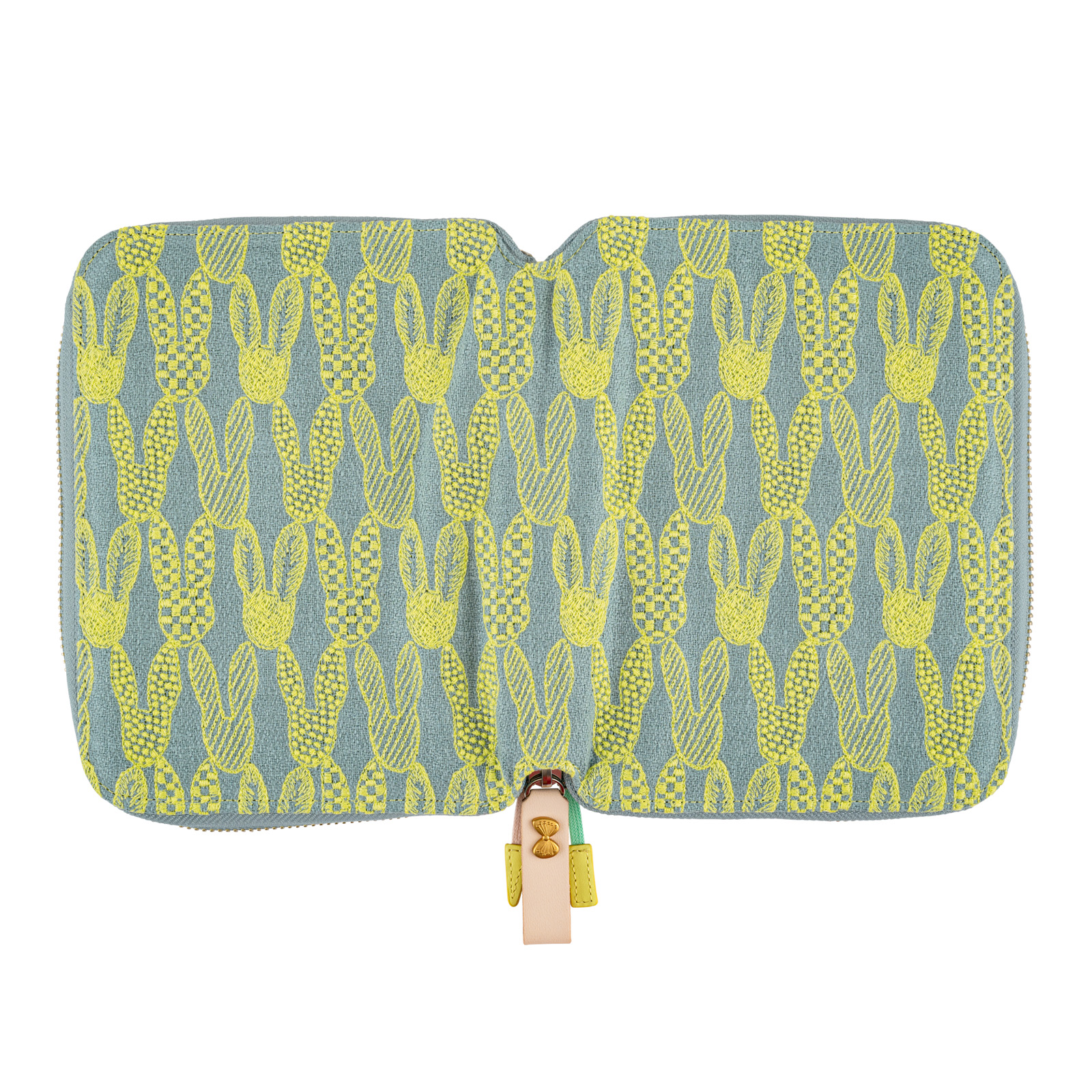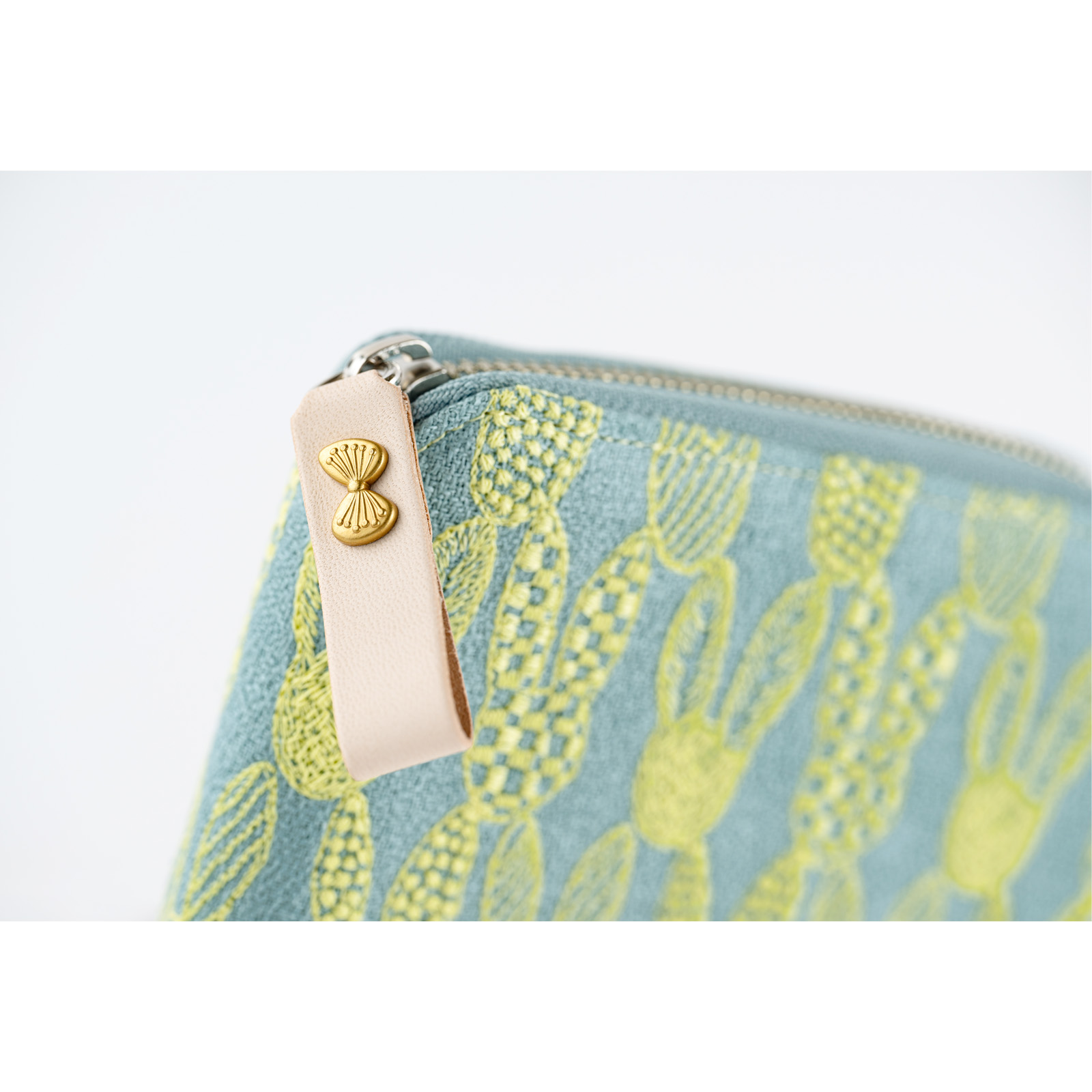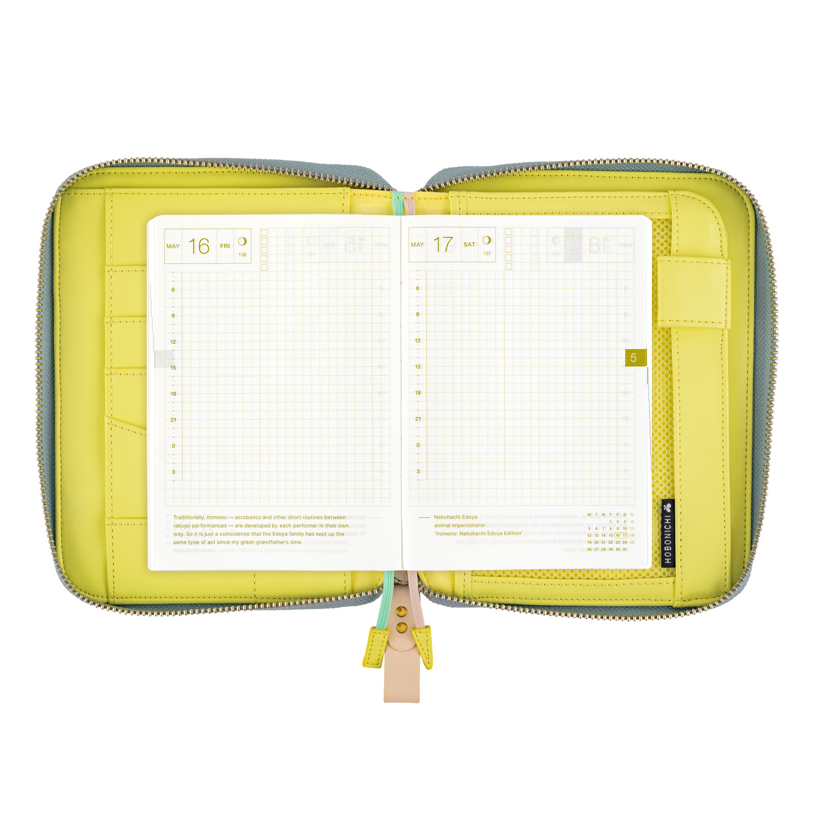 Il lino azzurro ricamato con fili gialli dà un'impressione luminosa e leggera. Il ricamo conferisce un tocco delicato che aggiunge piacere al design. Hobonichi ha scelto lo stesso giallo brillante per l'interno e per il filo da ricamo. La copertina include due segnalibri, uno azzurro e l'altro rosa. Il tirante della cerniera è realizzato in pelle naturale e include un grazioso ciondolo a farfalla.