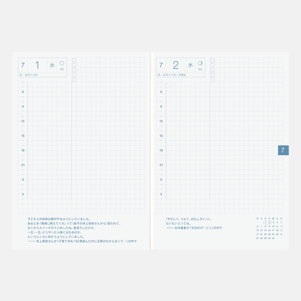 Ogni pagina giornaliera include una citazione in lingua giapponese, selezionata dal sito Hobonichi, che accompagna la giornata con una nota di ispirazione.