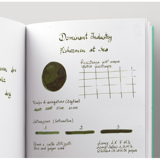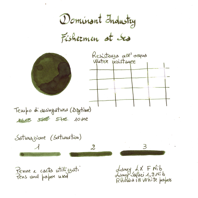 Dominant Industry Standard Fishermen at Sea è un inchiostro per penne stilografiche di un bellissimo verde scuro. E' contenuto in una bottiglia di vetro da 25 ml con una dust bag ed una piccola pipetta.