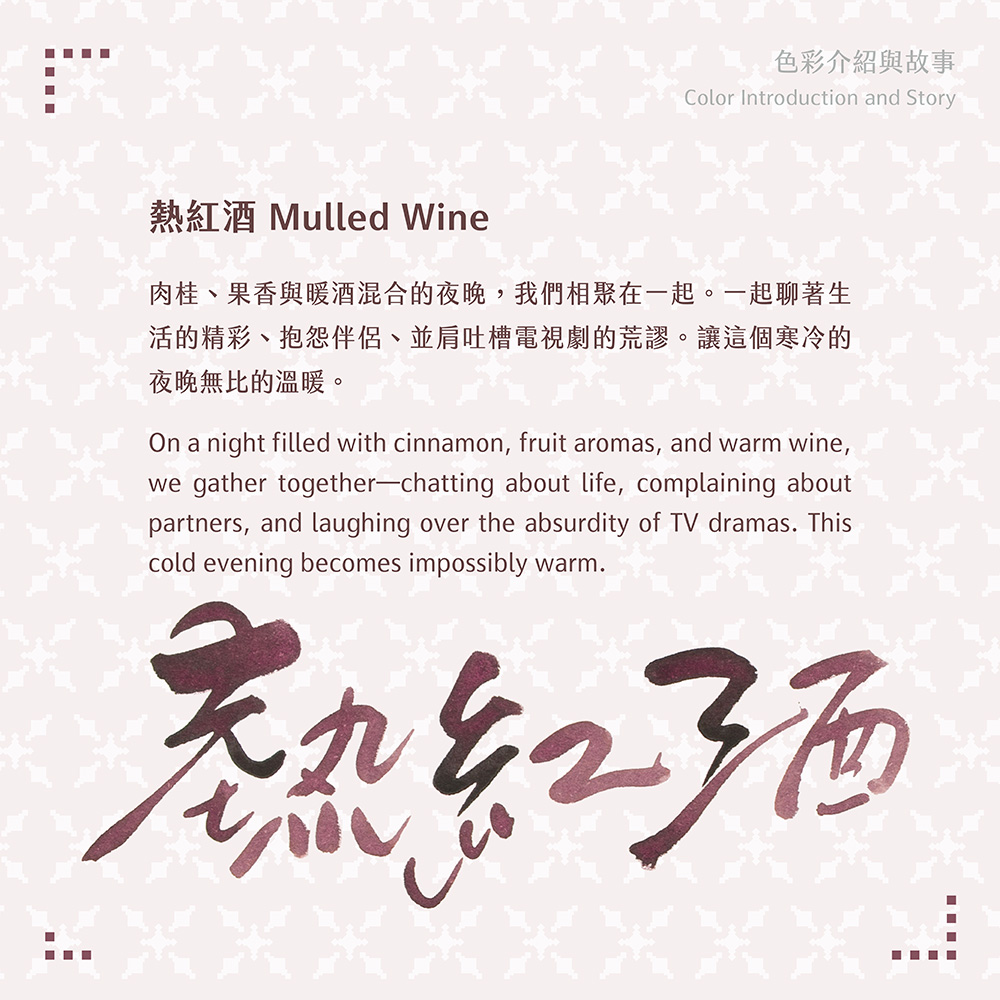 Un rosso caldo e speziato ispirato al vin brulé, che richiama le serate invernali tra profumi avvolgenti e momenti di convivialità.