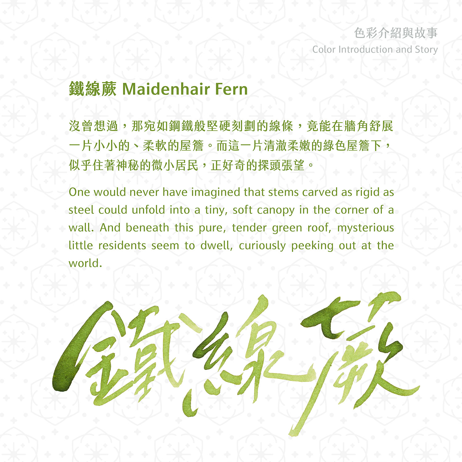 Maidenhair Fern si ispira alla delicatezza sorprendente della felce capelvenere, capace di trasformare sottili steli rigidi in una trama leggera e morbida, quasi sospesa. Tra le sue fronde leggere sembra nascondersi un piccolo mondo silenzioso, fatto di dettagli minuscoli e di una natura che osserva con discrezione.