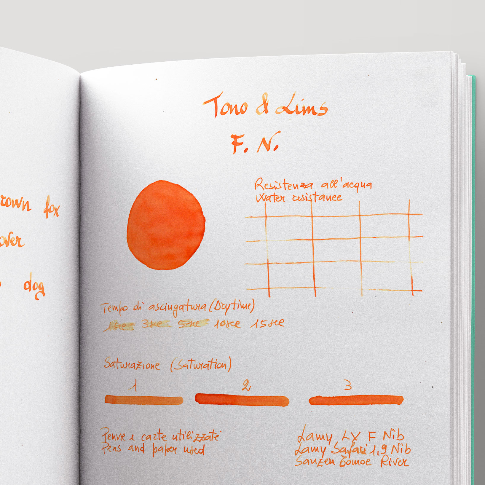 Tono & Lims F.N. è un inchiostro per penne stilografiche da 30 ml della Friendship Collection. Un arancione luminoso (RGB 246, 155, 88) dal carattere caldo e vivace.