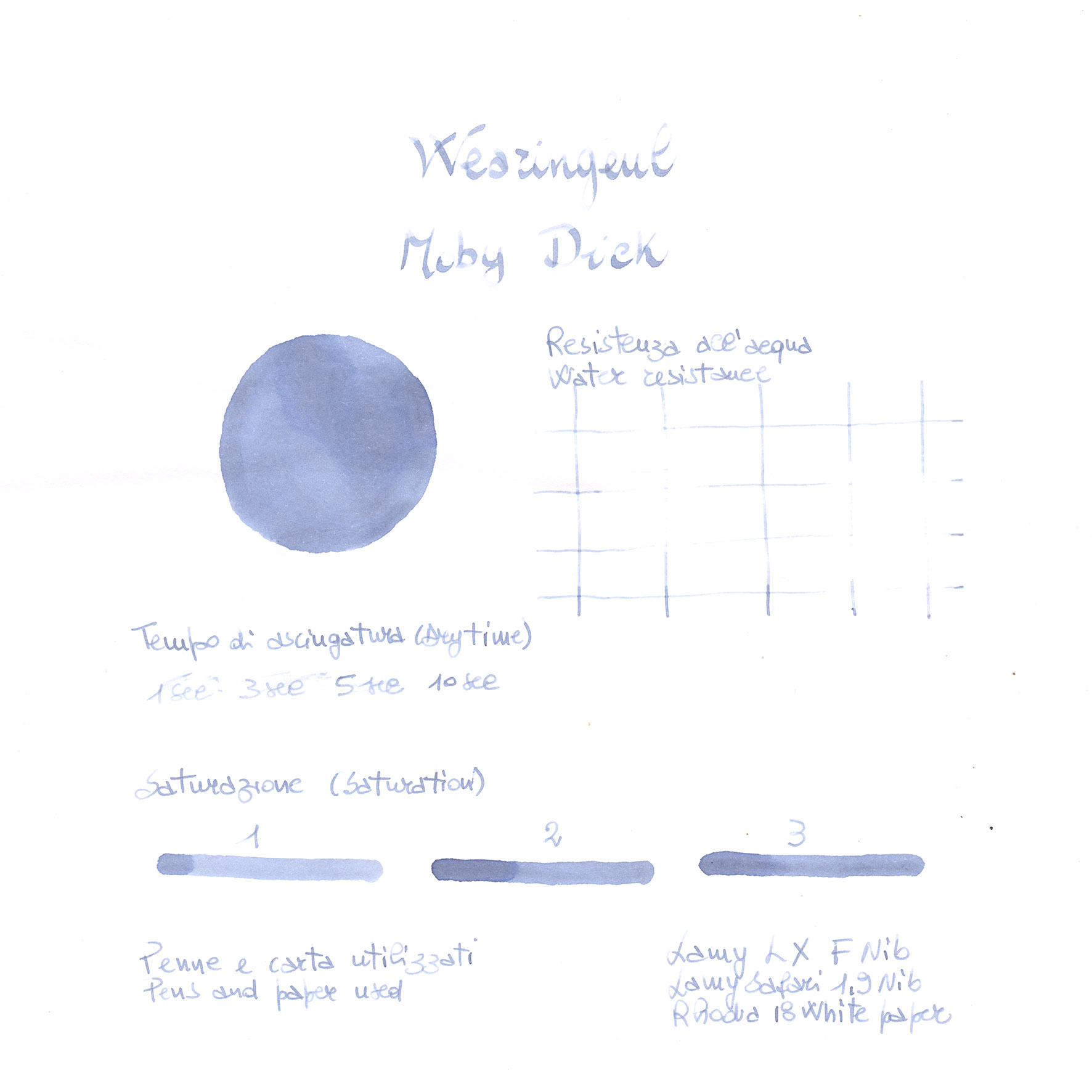 Così come il capodoglio, l'inchiostro Wearingeul Moby-Dick ha un colore blu-grigio con sfumature dinamiche e caratteristiche. Mostra una tonalità di grigio nelle zone meno dense ed un blu dove il liquido si deposita con più densità.