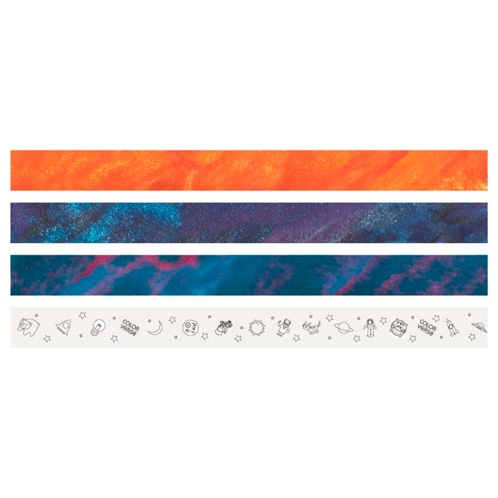 Il set include un regalo speciale: 4 washi tape esclusivi. Tre di questi riportano campioni colore dei tre inchiostri selezionati; il quarto presenta un design dedicato ai personaggi iconici di Colorverse.