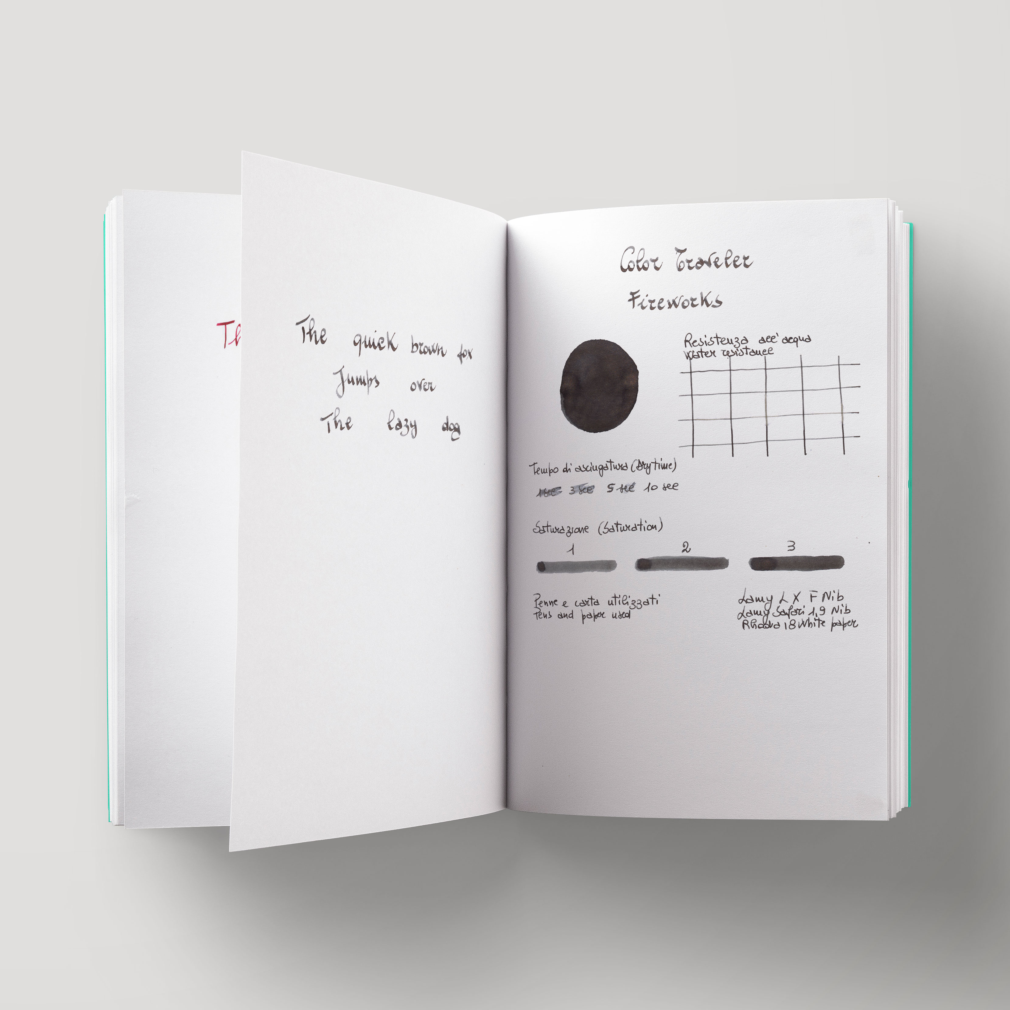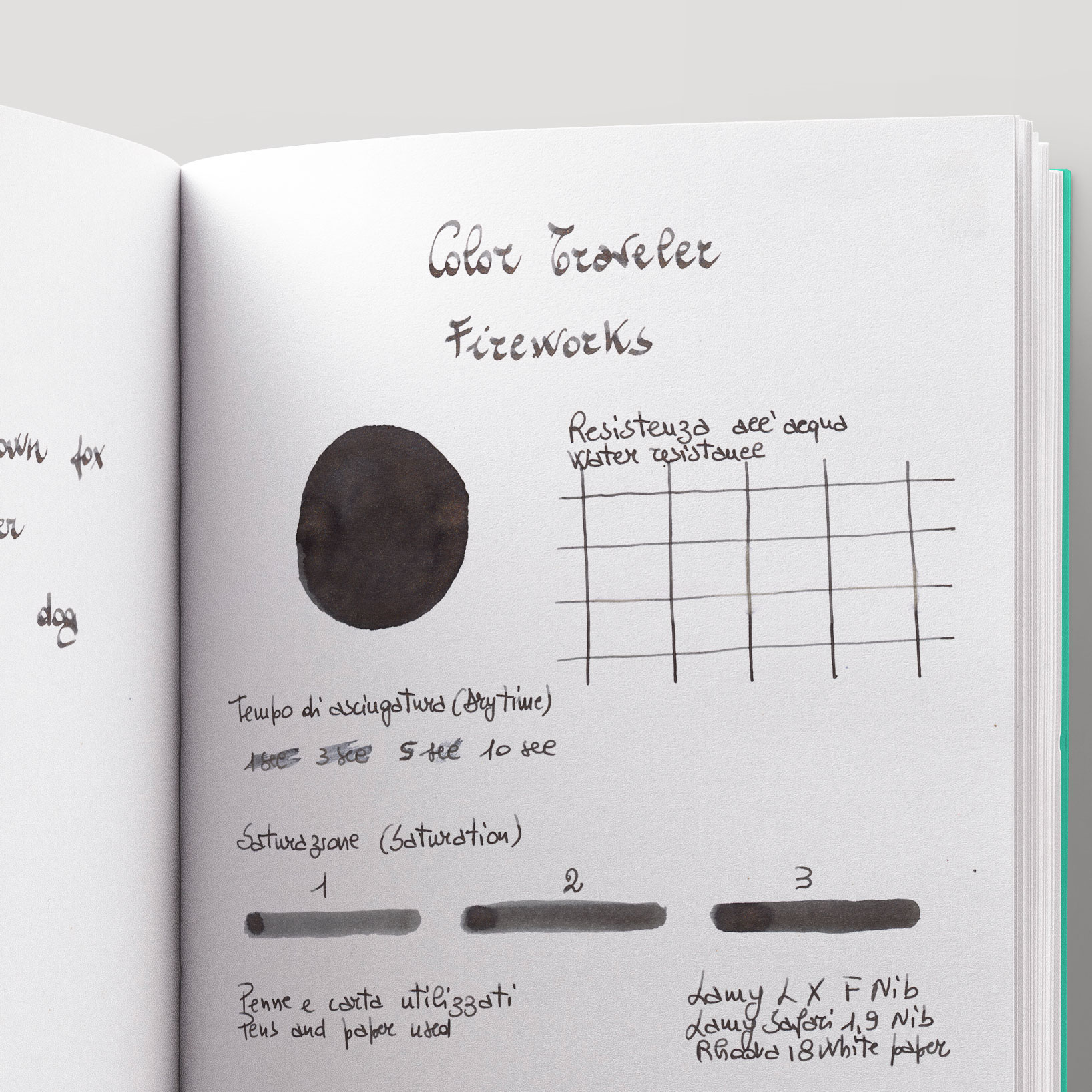 Color Traveler Time Clips Fireworks è un inchiostro per penne stilografiche shimmering che ripropone l'immagine dei fuochi di artificio in un cielo buio con un colore grigio scuro e glitter blu, rossi ed oro.