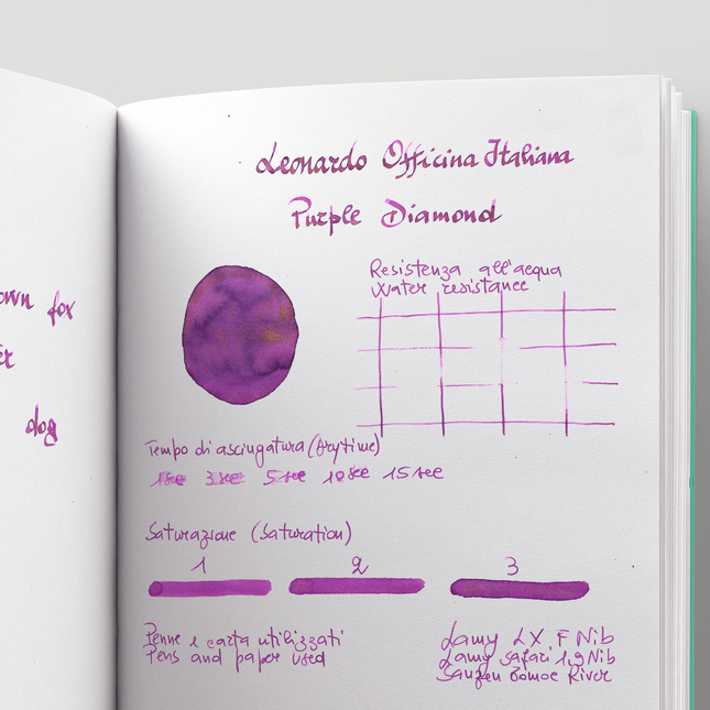 Leonardo Purple Diamond è un inchiostro shimmering profondo e raffinato, che unisce l’intensità del viola a riflessi luminosi e cangianti. Ogni tratto rivela una sfumatura diversa, rendendo la scrittura un’esperienza visiva unica e preziosa.