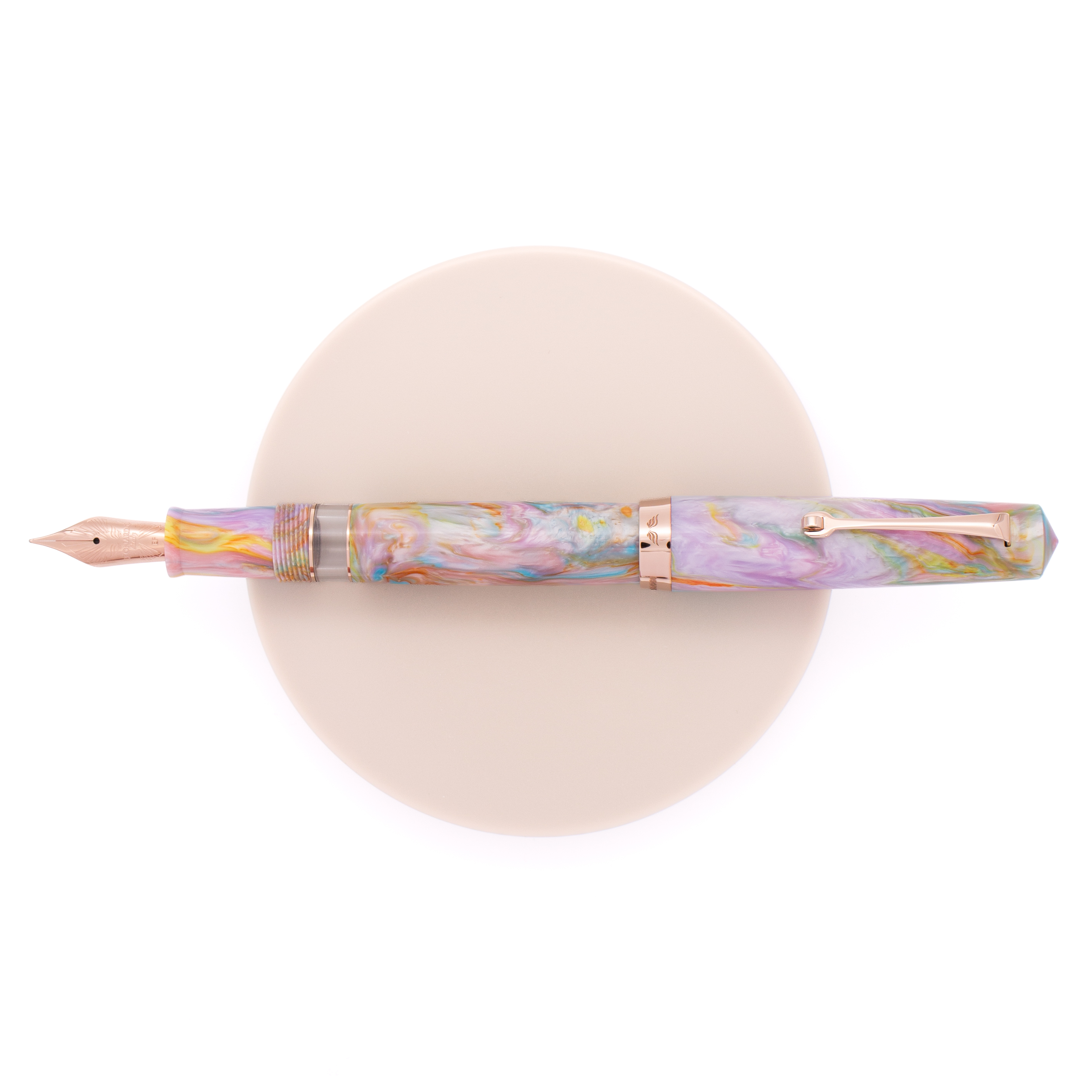 La versione Primary Manipulation 4 è caratterizzata da una composizione ricca e luminosa, in cui toni caldi e freddi si intrecciano creando un effetto marmorizzato molto dinamico. Sfumature di turchese e verde si alternano a inserti rosati e zone più chiare, attraversate da venature dorate e aranciate che aggiungono profondità e movimento. Le finiture oro rosa si integrano perfettamente con la palette della resina, valorizzandone le tonalità e conferendo alla penna un aspetto elegante e contemporaneo.