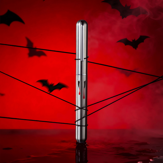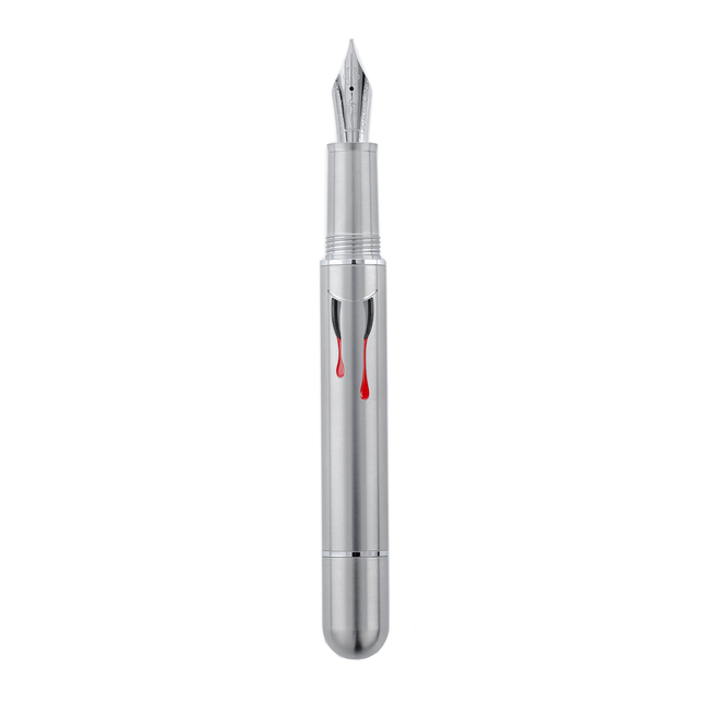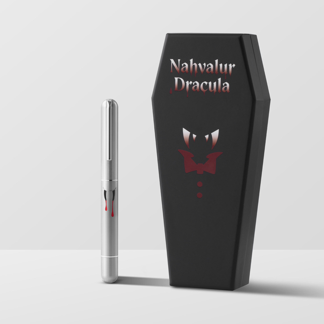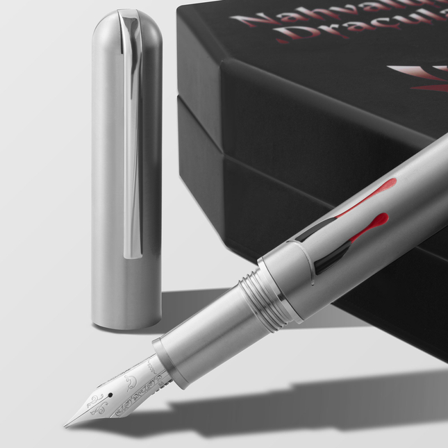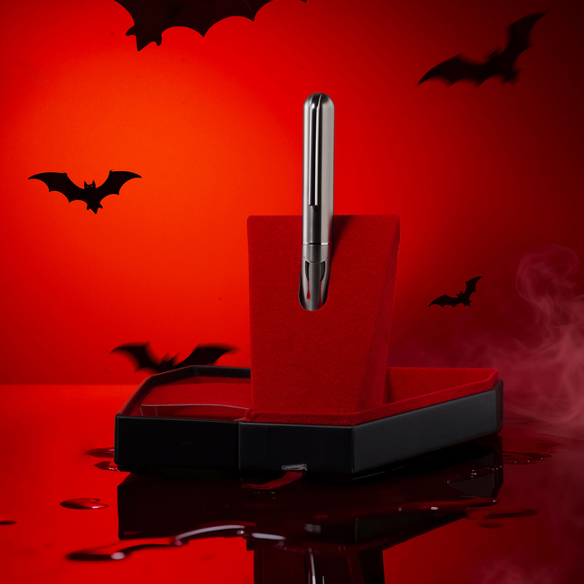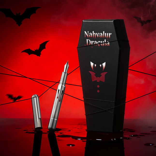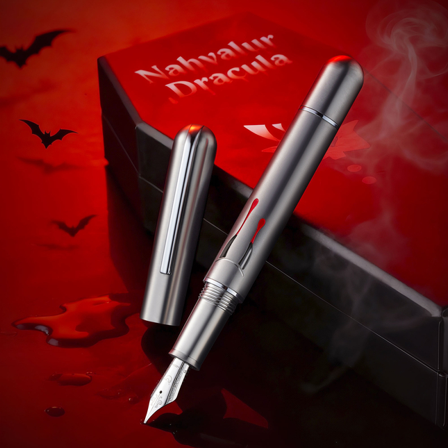 Una penna stilografica in titanio dal fascino oscuro, con finestra a forma dei denti di Dracula e gocce di lacca rossa applicate a mano. La Nahvalur Nautilus Dracula unisce arte e ingegneria in una creazione unica dal carattere teatrale.