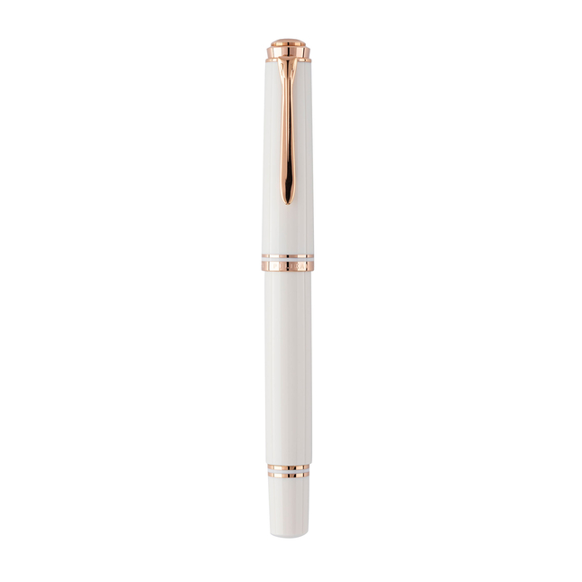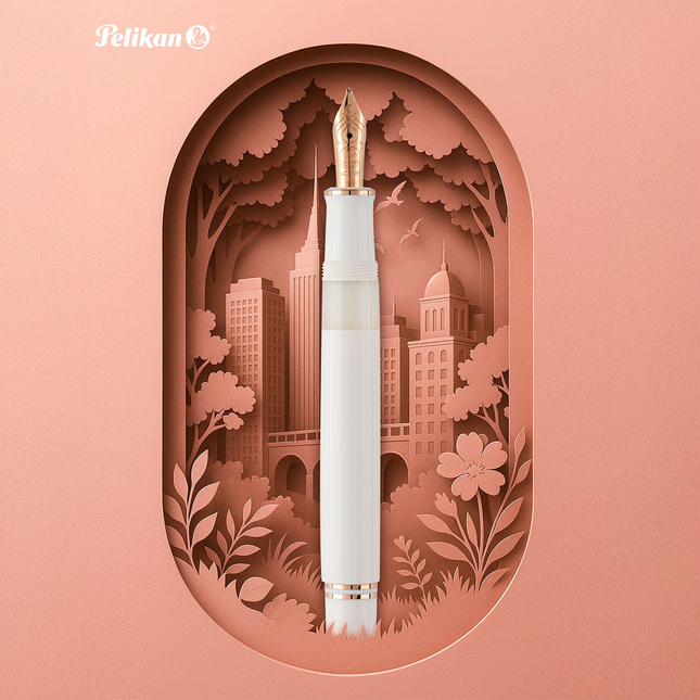 La Pelikan Souverän M600 White & Rose Gold è una penna stilografica a stantuffo in edizione speciale che coniuga l’iconico design Pelikan con una nuova e sofisticata combinazione cromatica. Il corpo in resina bianca lucida, levigato a specchio, si abbina con grazia ai dettagli placcati in oro rosa, dando vita a un equilibrio perfetto tra freschezza contemporanea e tradizione artigianale.