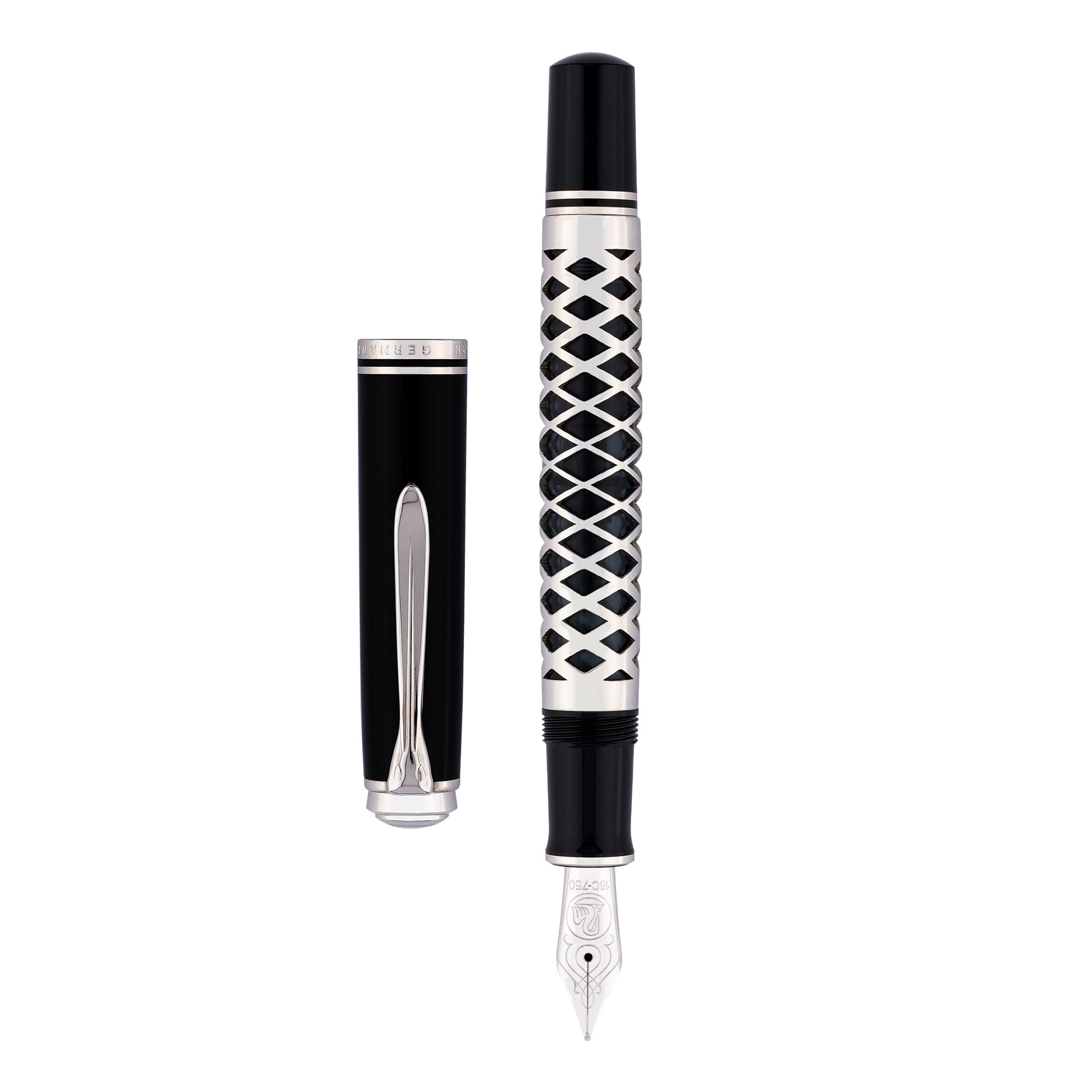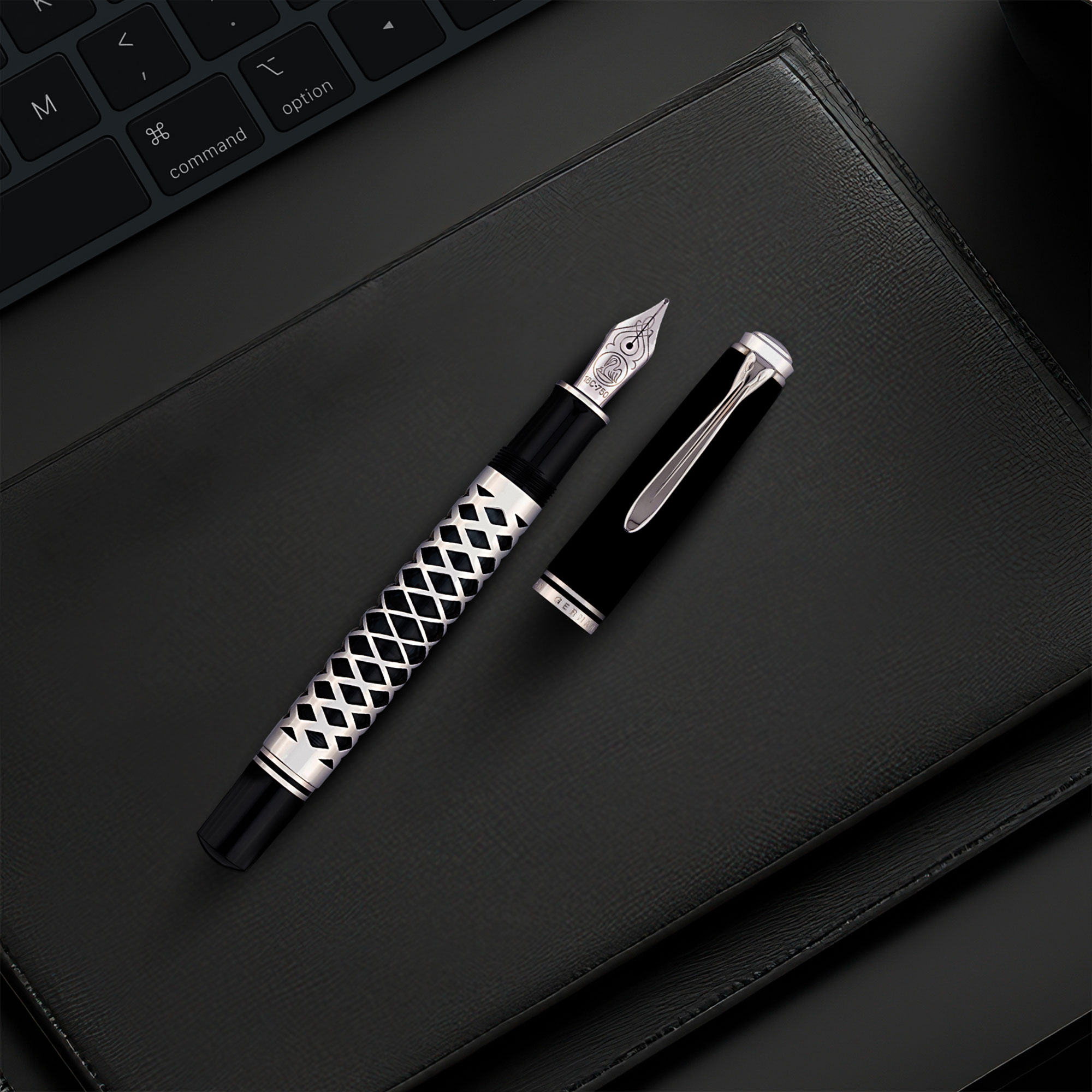 Una reinterpretazione moderna della Souverän: resina nera lucida con guaina metallica intagliata al laser, pennino in oro 18k rodiato e caricamento a stantuffo. Una penna dal design architettonico e dall’anima Pelikan.