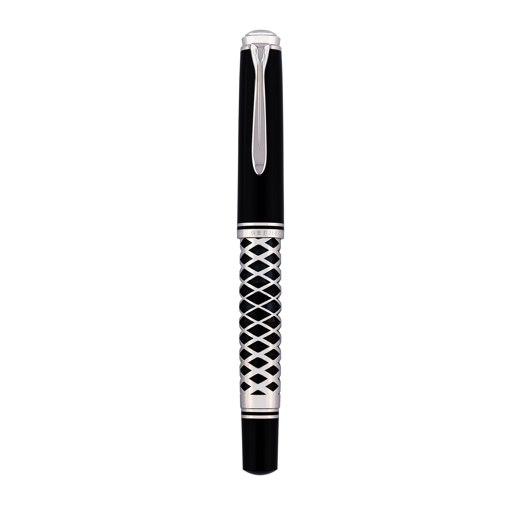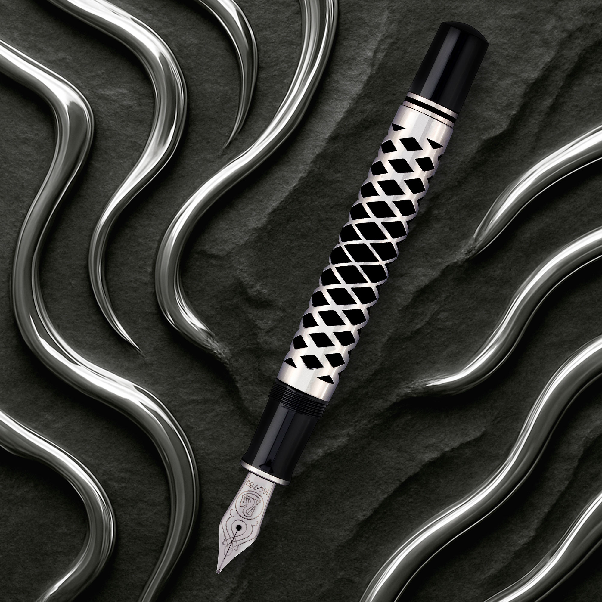 Il corpo è realizzato in resina acrilica nera lucida, rivestita da una guaina metallica intagliata al laser con motivo geometrico. Il contrasto tra le superfici lisce e l’incisione del metallo crea un effetto architettonico unico, non solo alla vista ma anche al tatto, trasformando la penna in un vero e proprio oggetto di design.