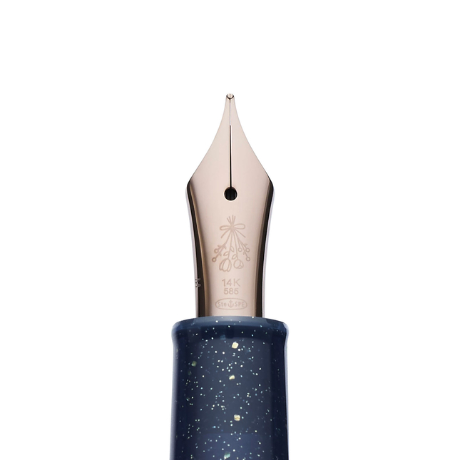 Sailor Professional Gear Slim Dried Flower Hydrangea è equipaggiata di un pennino in oro 14k con una speciale incisione di un mazzo di fiori secchi. Si ricarica con cartucce/converter ad attacco proprietario Sailor.