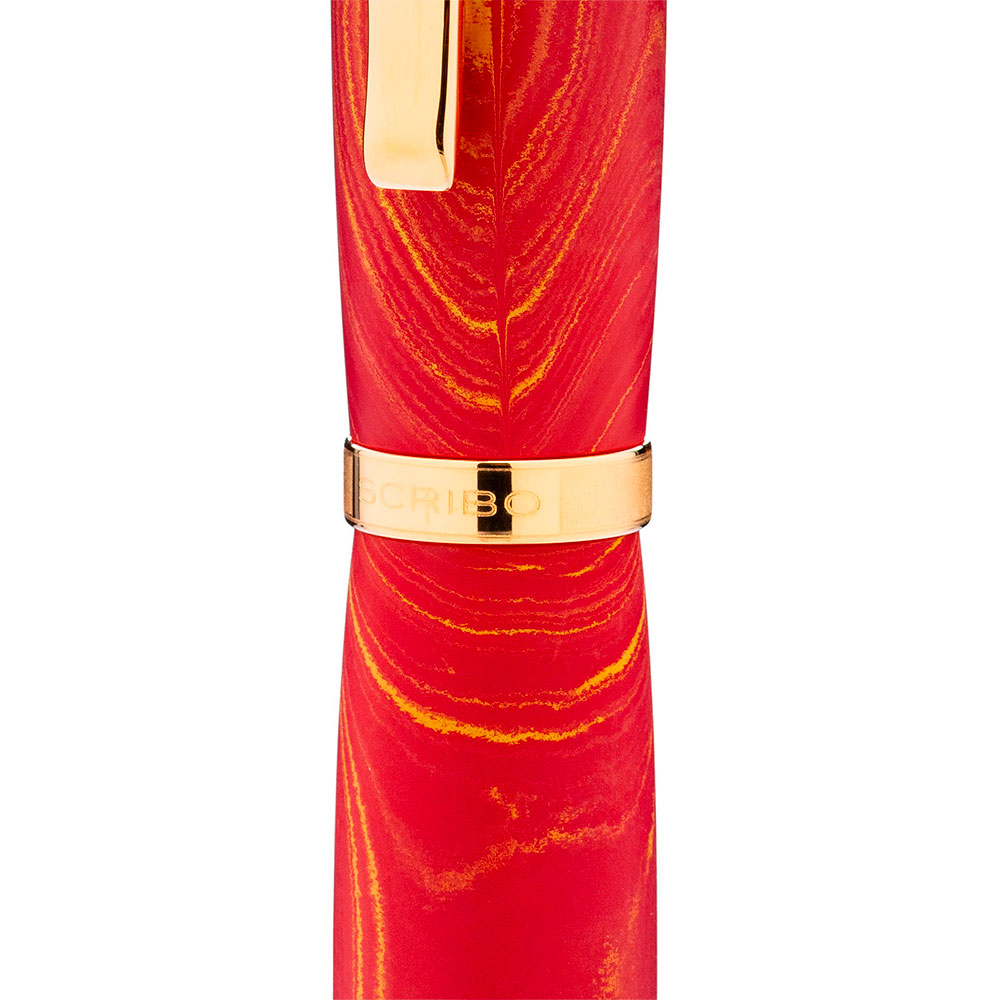 La penna è realizzata in ebanite, materiale nobile e vivo, lavorato per ottenere una finitura opaca dal tatto caldo e profondo. La versione Liber si distingue per la sua colorazione rossa attraversata da venature gialle, impreziosita da finiture in oro, un richiamo diretto al calore della terra, alla passione civile e alla forza delle idee che prendono forma sulla carta.