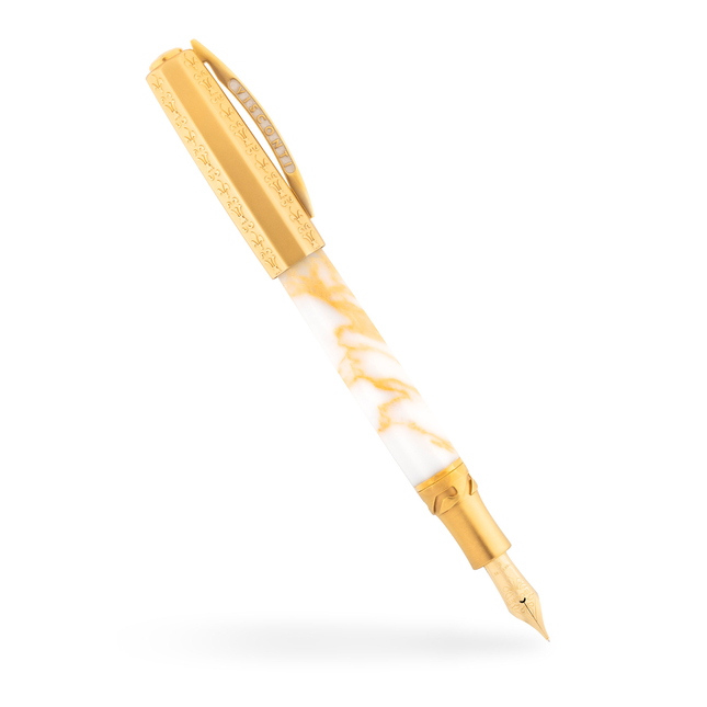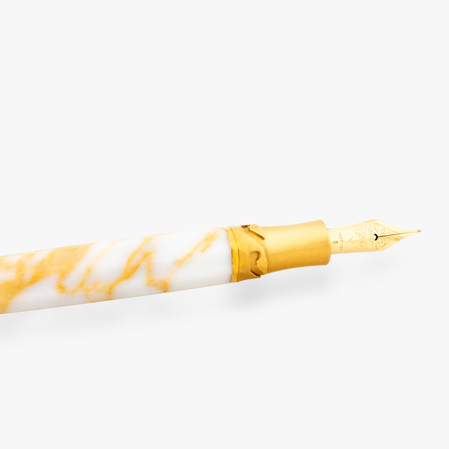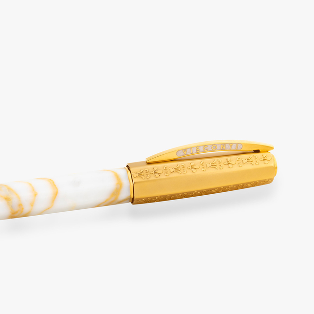 Tutte le finiture metalliche sono realizzate in ottone placcato oro giallo, in modo da fondersi perfettamente con le calde tonalità dorate del marmo. La stessa finitura in oro giallo si ritrova sul prezioso pennino Visconti in oro 18 carati. Cappuccio con sistema di chiusura "Hook Safe Lock" e sistema di caricamento Power Filler concludono l'identikit di questa penna stilografica.