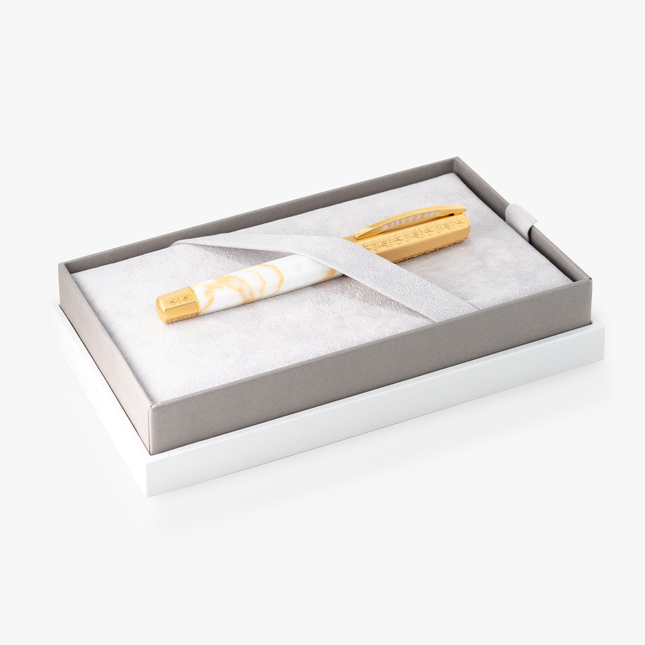 La penna è realizzata in pregiato marmo di Carrara, oro giallo e ottone, elementi che si fondono elegantemente grazie alla ricerca dei nostri artigiani. Il fusto, in marmo, è completato da fondello finemente inciso e decorato con simboli della tradizione fiorentina, come il famoso giglio di Firenze. Le stesse decorazioni si ritrovano sul prezioso cappuccio della penna, che monta una clip impreziosita da smalto bianco.