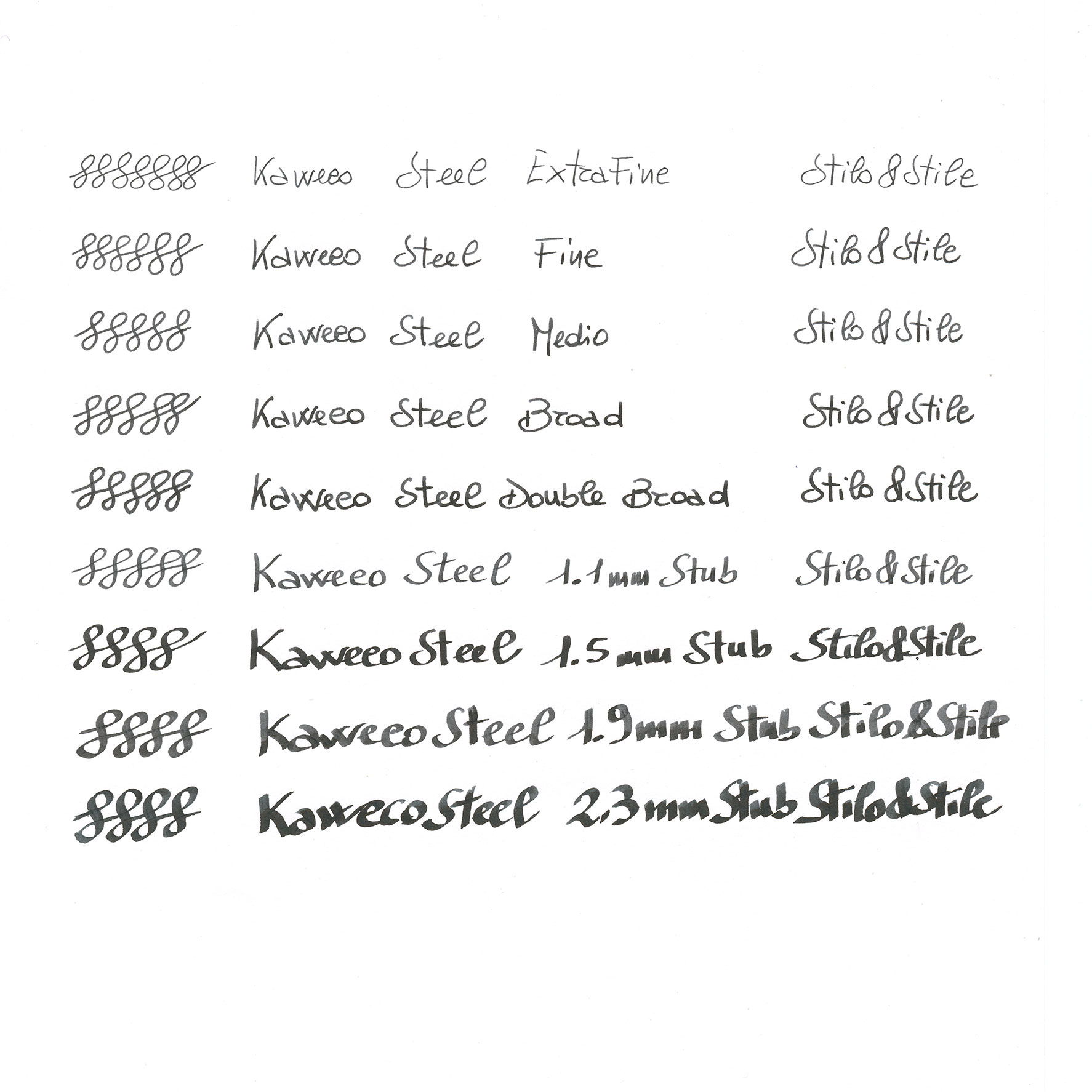 Il sistema di scrittura è completato da un pennino intercambiabile Kaweco 060, prodotto in Germania e disponibile in diverse gradazioni dalla Extra Fine alla Double Broad, per adattarsi a ogni stile di scrittura.