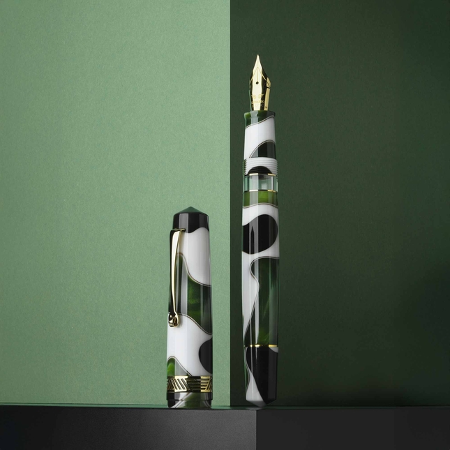Toni verdi e marroni ispirati alla natura, finiture dorate e pennino in oro 14k con conduttore in ebanite. Un’eleganza calda e autentica.