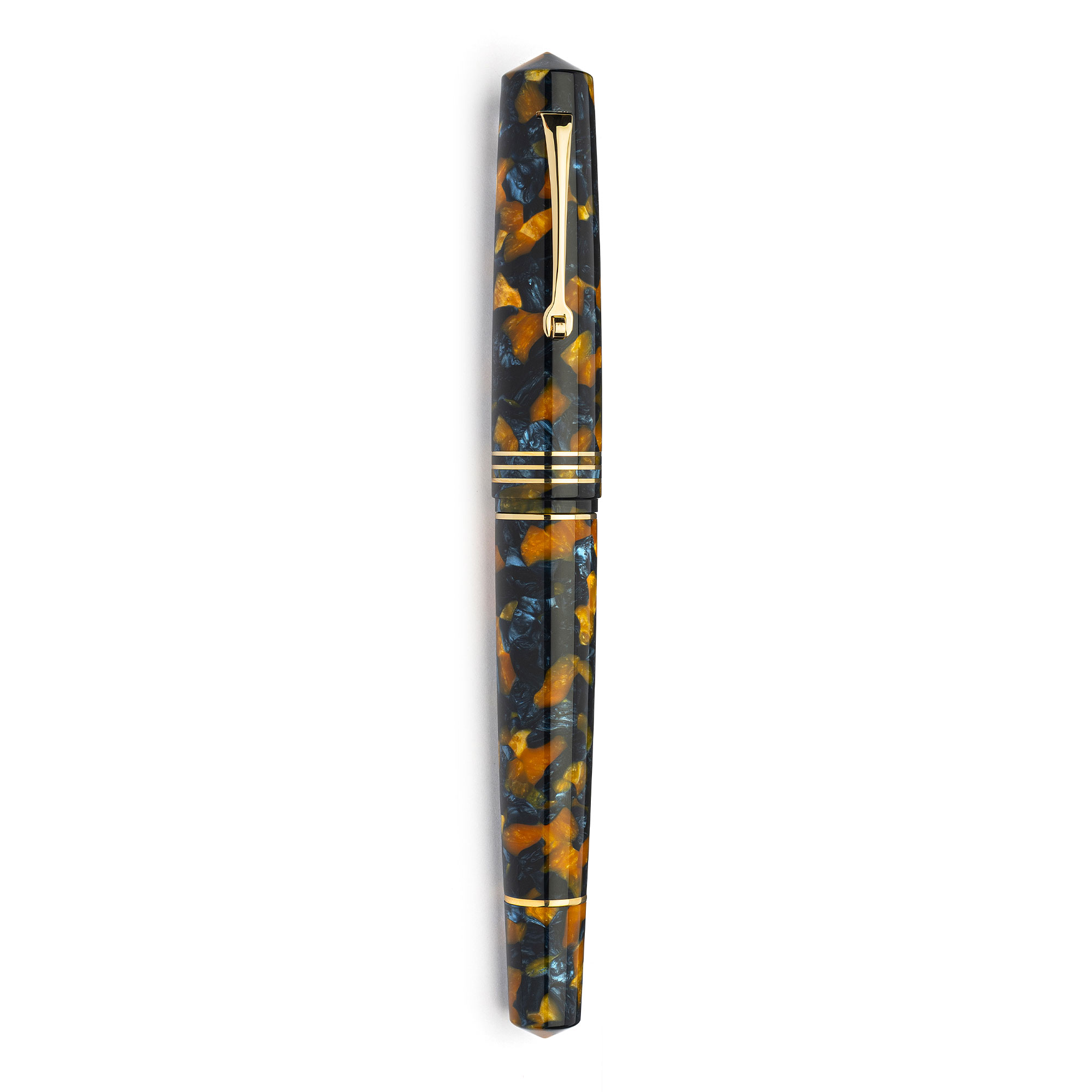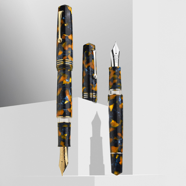 La Leonardo Momento Zero Grande 2.0 Crepuscolo Marino & Oro è una penna stilografica che rievoca il fascino del tramonto sul mare, con colori caldi e avvolgenti che sfumano tra ocra, arancio e blu. La resina traslucida italiana, lavorata con cura artigianale, cattura la luce come le onde al crepuscolo, regalando una visione profonda e cangiante.