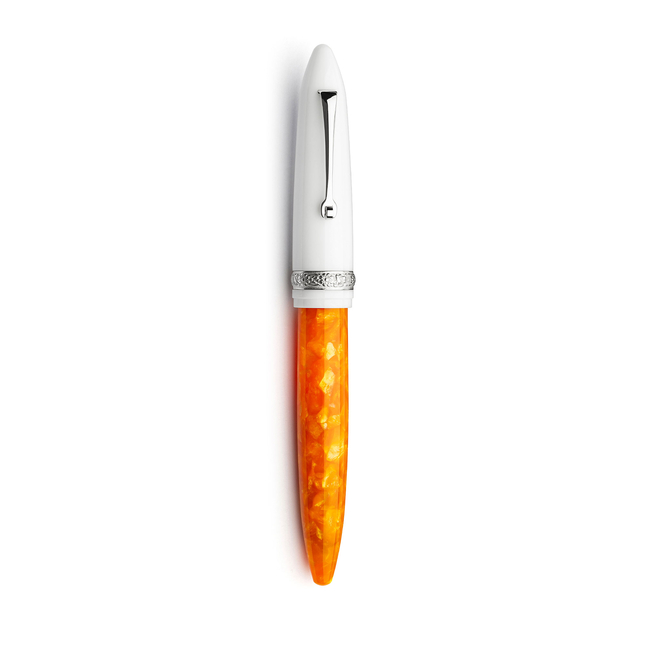 Leonardo x Dolcevita Furore Terra degli Aranci & Rodio, penna stilografica in resina bianca e arancio marmorato con finiture rodiate, pennino in acciaio e caricamento a cartuccia/converter. Un inno luminoso alla Dolce Vita italiana.