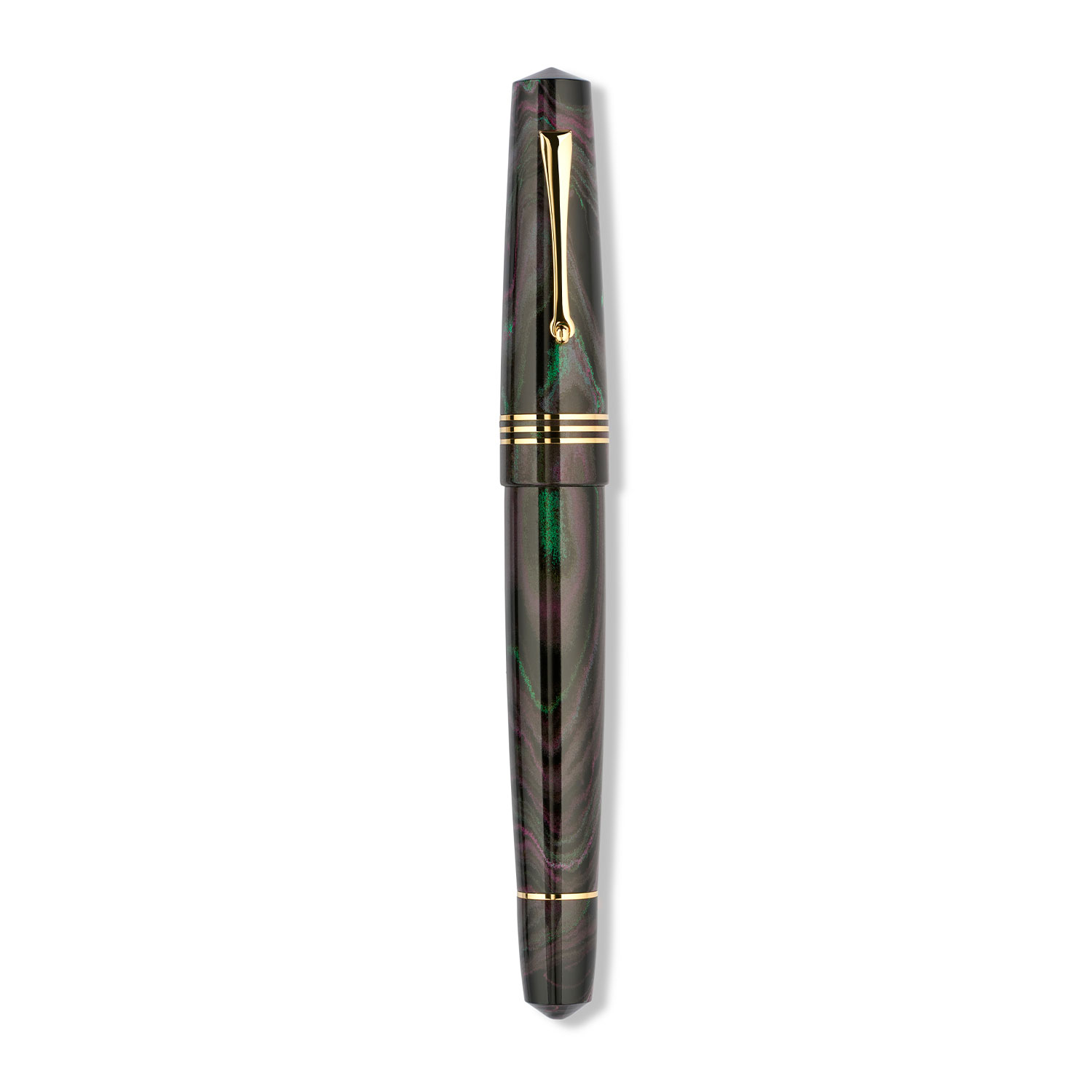 Il corpo è realizzato in ebanite, materiale storico dell’alta scrittura apprezzato per leggerezza, stabilità e comfort tattile. Le particolari miscele cromatiche si ispirano alle luci dell’aurora boreale: venature profonde e giochi di colore rendono ogni penna unica, pur mantenendo una forte coerenza estetica.