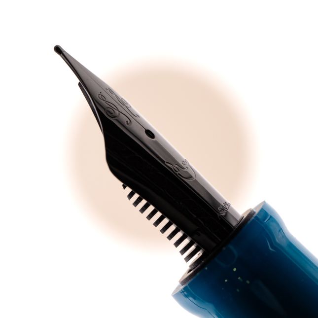 Design italiano e spirito mediterraneo per questa stilografica blu traslucida con finiture in rutenio. Moderna e decisa, è la prima penna Nahvalur made in Italy.