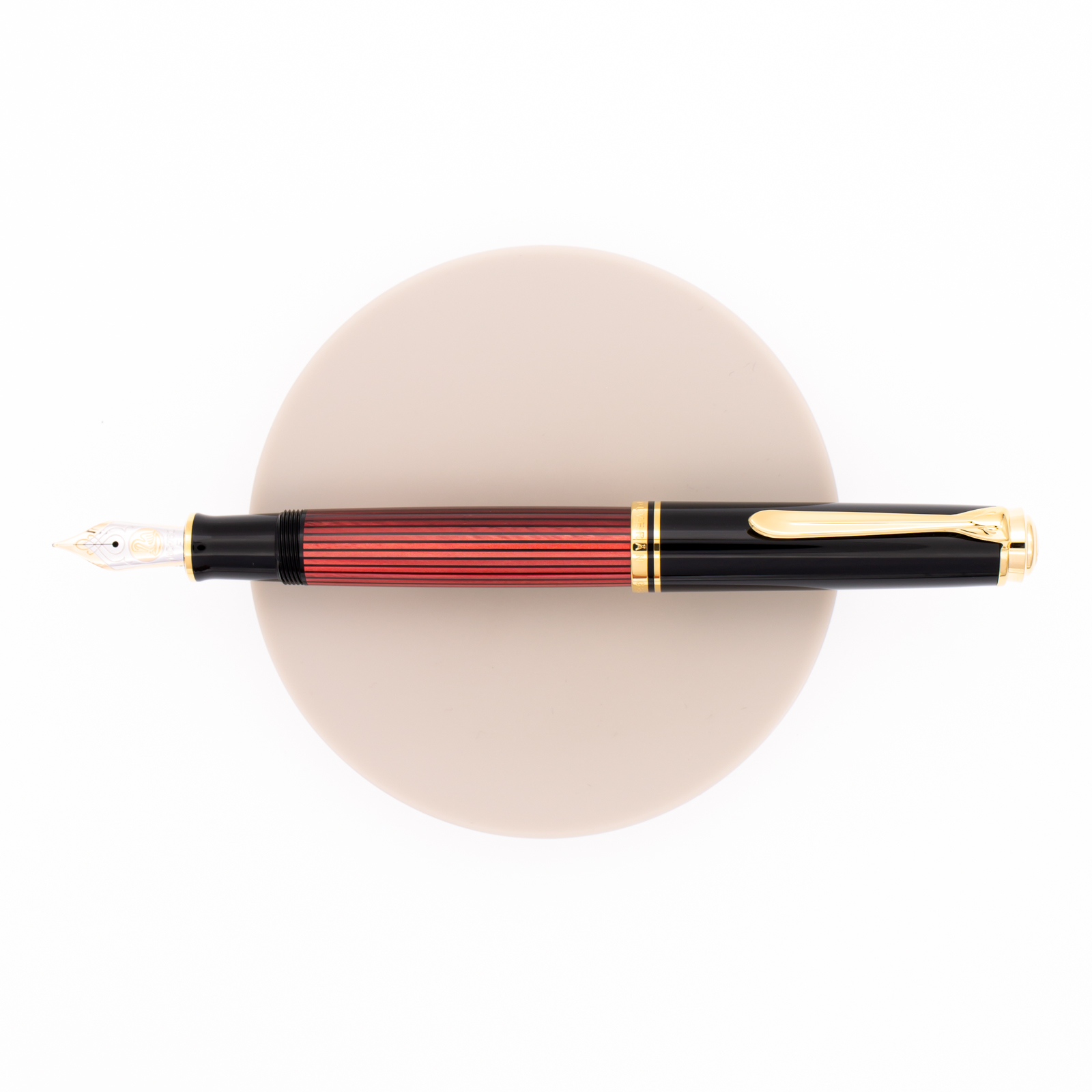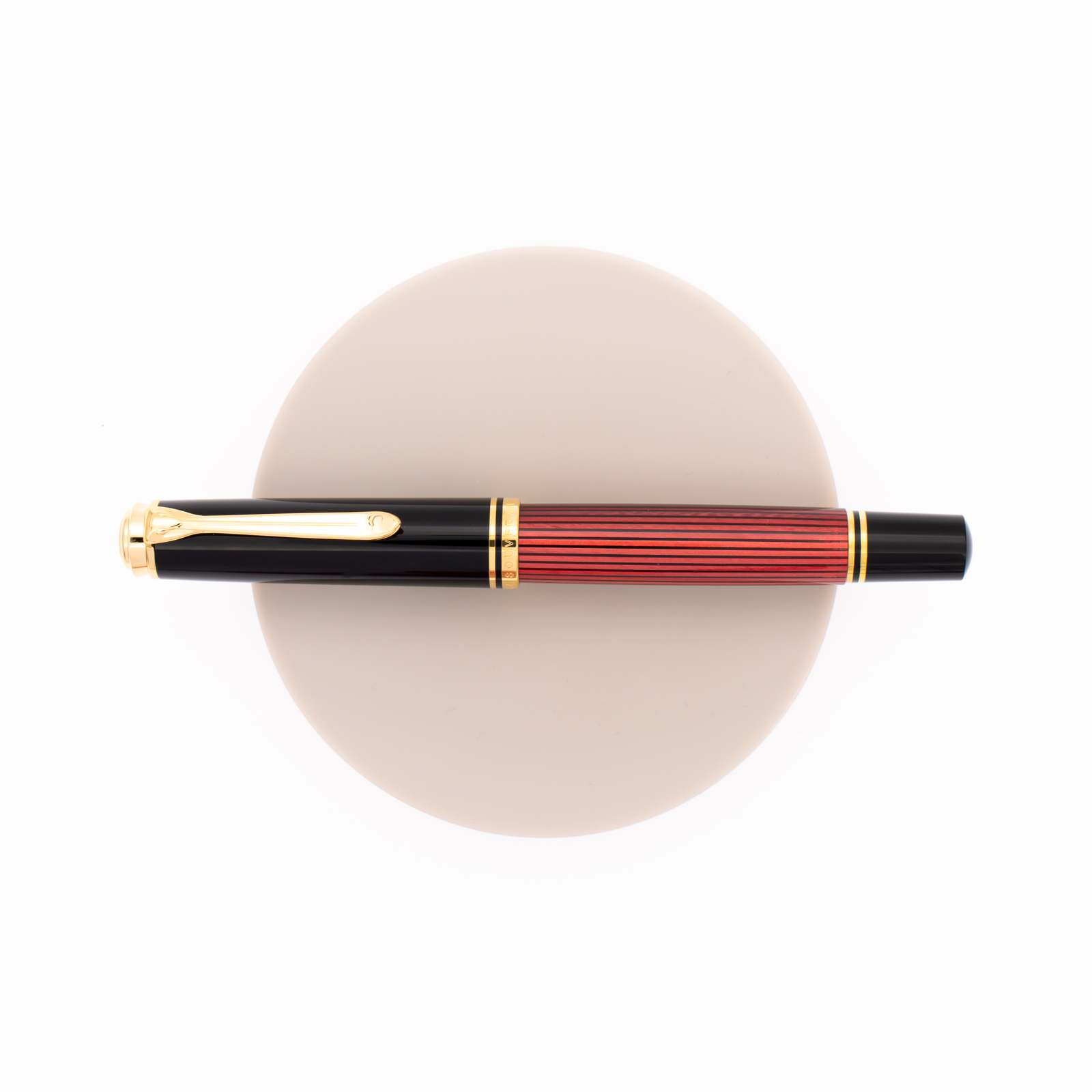 Pelikan Souveran M800 Black-Red è un classico senza tempo realizzato in acetato di cellulosa dalla ricca tonalità di rosso con motivo a strisce che si armonizza meravigliosamente con elementi neri e finiture dorate.