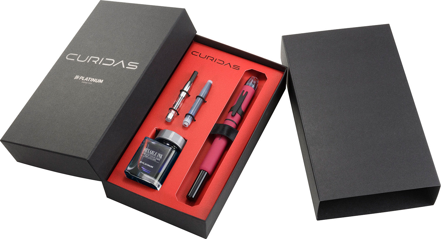 Platinum Curidas Matte Red è la versione con corpo satinato rosso e dettagli neri della penna stilografica con pennino retrattile. Arriva in un set contenente il converter, una cartuccia ed una bottiglia di inchiostro blu da 20 ml.