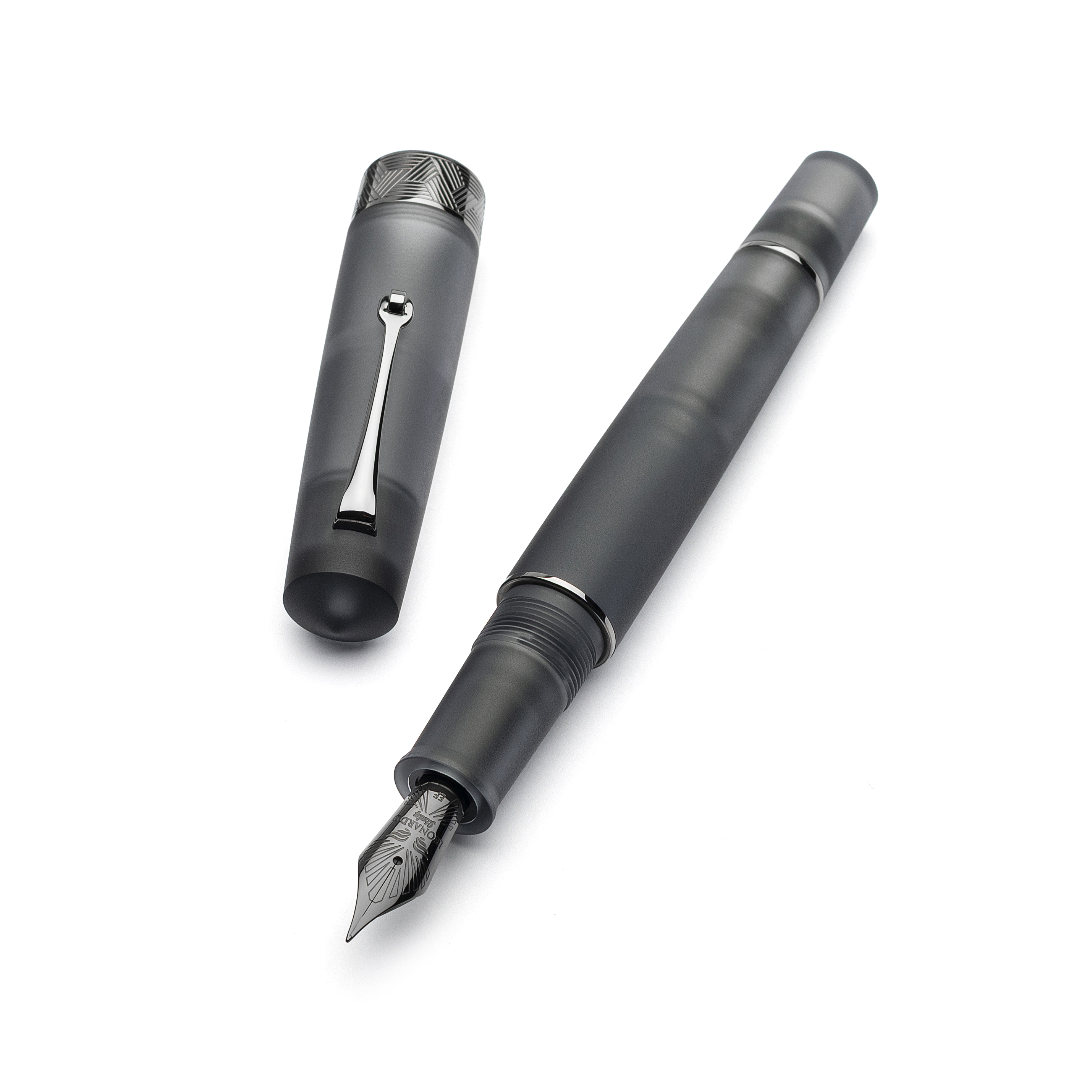 La Leonardo Momento Zero Grande Pura Grigia & Rutenio 14k è realizzata in resina trasparente satinata tramite sabbiatura con cristalli di quarzo e presenta la nuova fascia incisa ispirata all’Arte Geometrica greca. Monta un pennino in oro 14k #6 La Fenice con conduttore in ebanite e sistema di caricamento a pistone integrato da 1,5 ml.