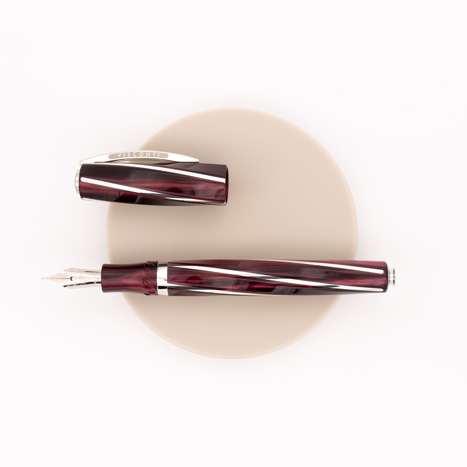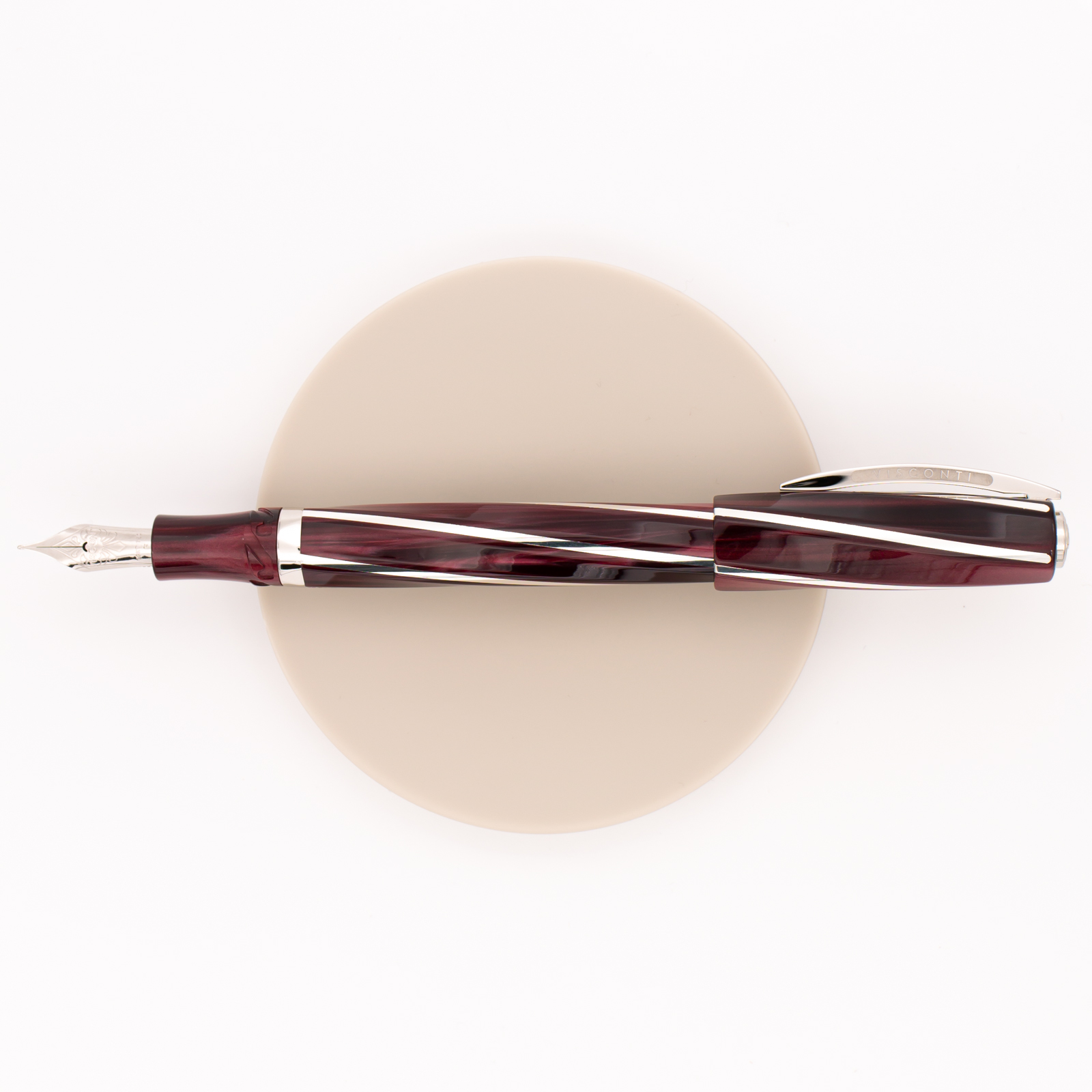 Visconti Divina Elegance Bordeaux rispetta i rapporti della Divina Proporzione ed è caratterizzata da una forma pentagonale e da 10 fili di argento inseriti a mano nella penna stilografica.