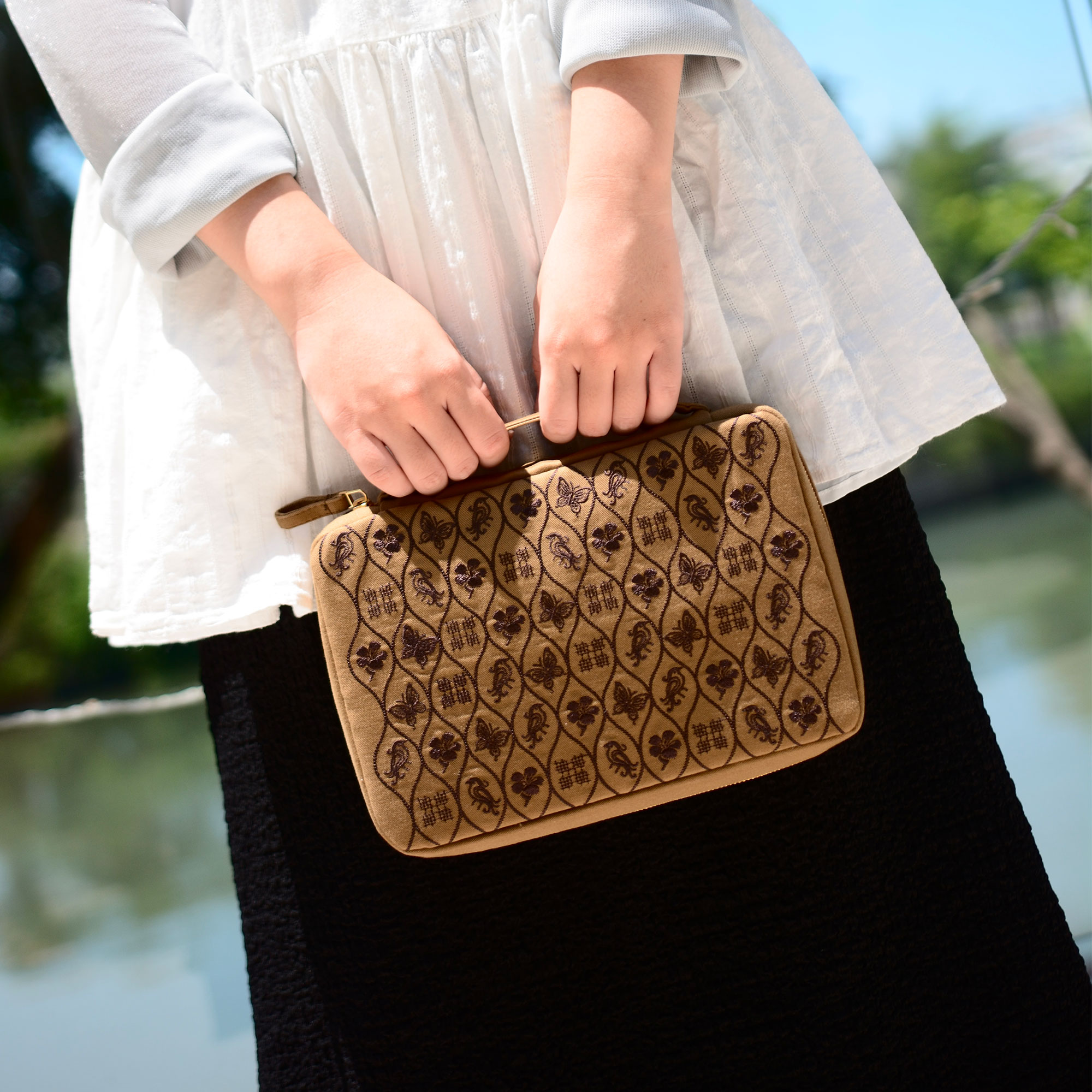 Il Kyoku Haku Portapenne 20 Posti Ricamato Marrone è una raffinata custodia per penne stilografiche, realizzata in tessuto color cammello con un elegante ricamo tono su tono ispirato ai motivi tradizionali giapponesi. Il disegno continuo di fiori, foglie e farfalle dona al portapenne un carattere caldo e sofisticato, perfetto da portare con sé o da esporre sulla scrivania.
