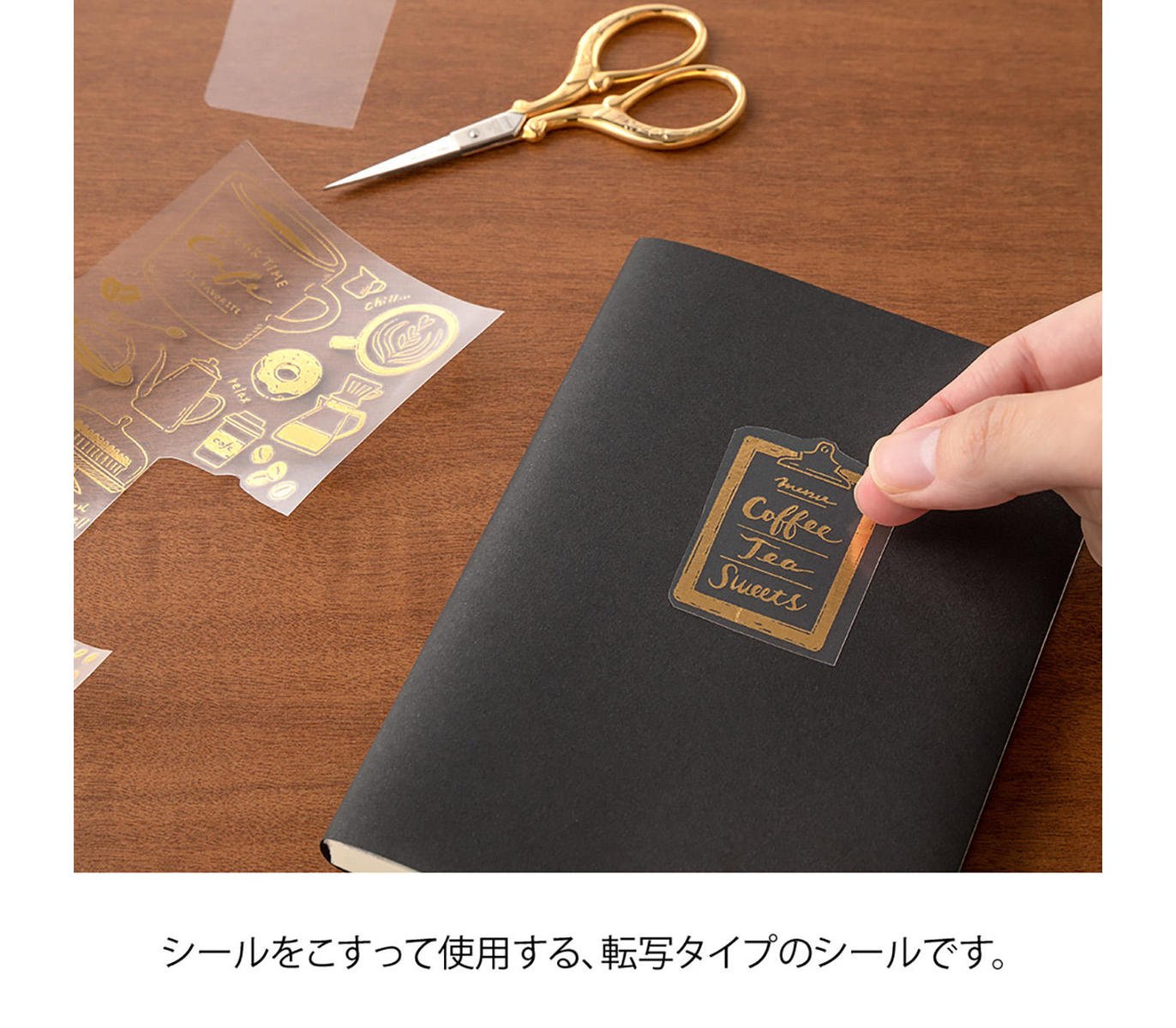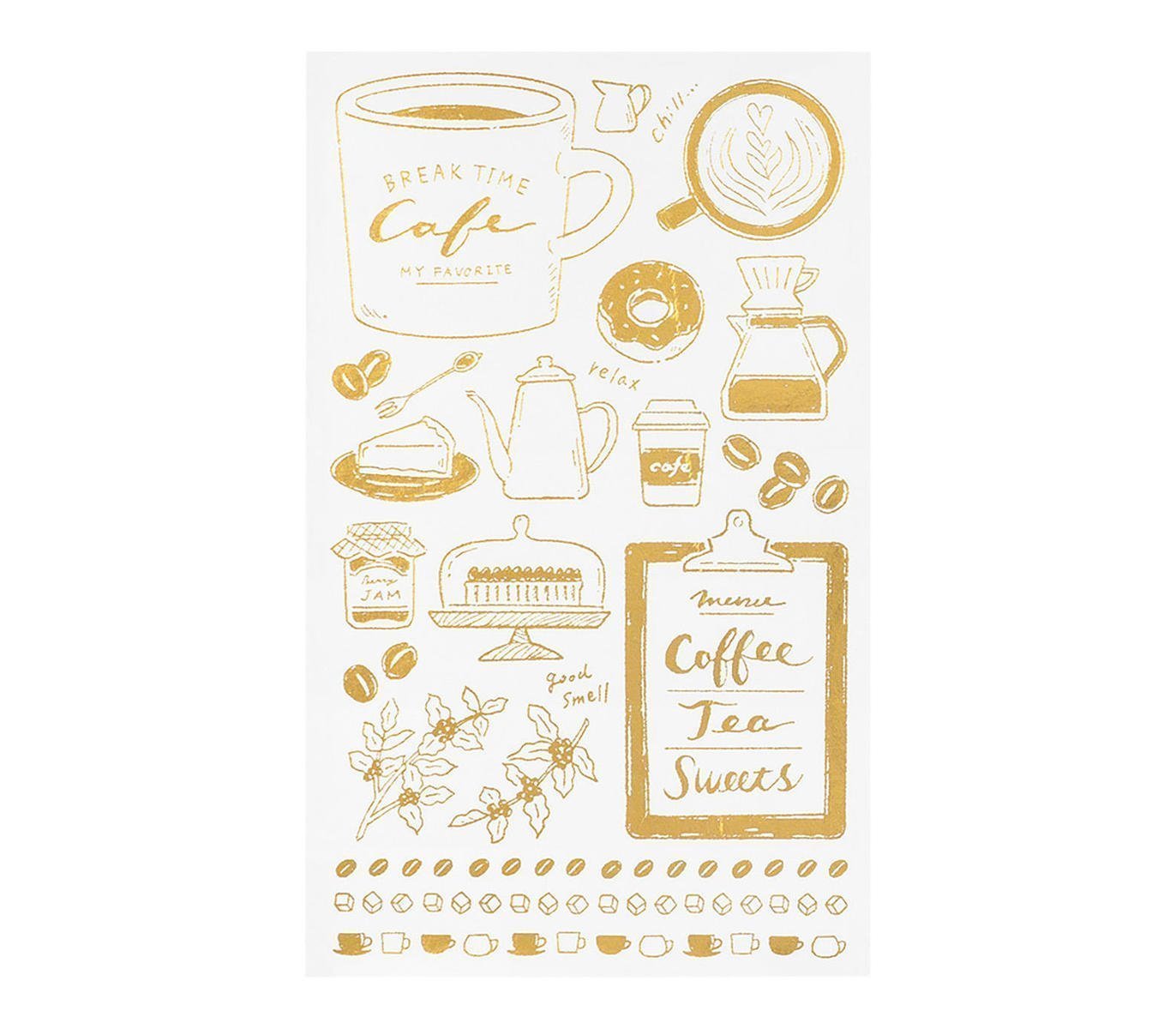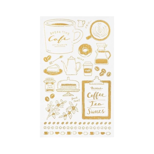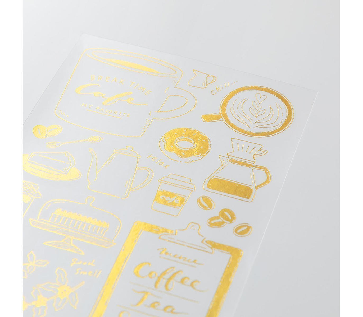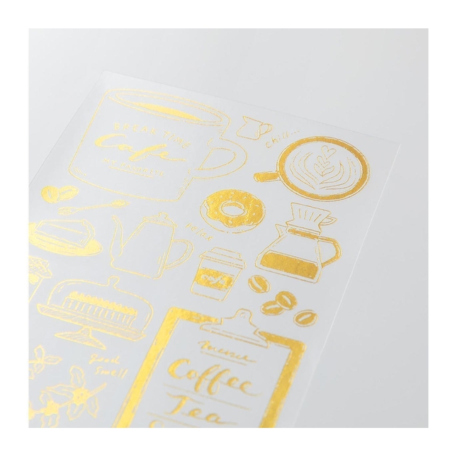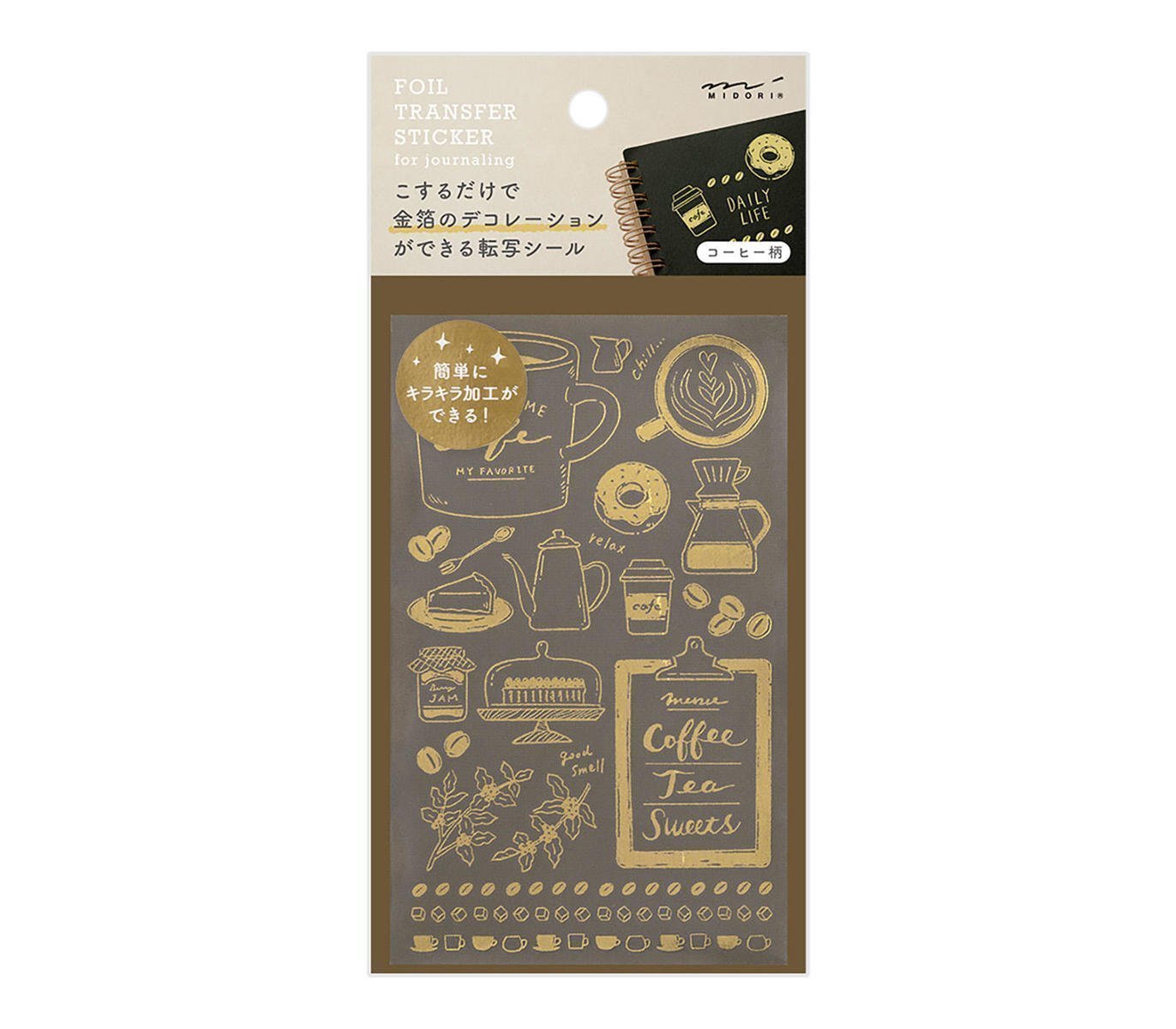 Midori Foil Transfer Sticker Adesivi Dorati Caffè è un set di adesivi (trasferelli) che possono essere utilizzati per creare decorazioni in lamina d'oro. Poiché non vengono creati rilievi, l'immagine è perfetta come se fosse stata stampata.