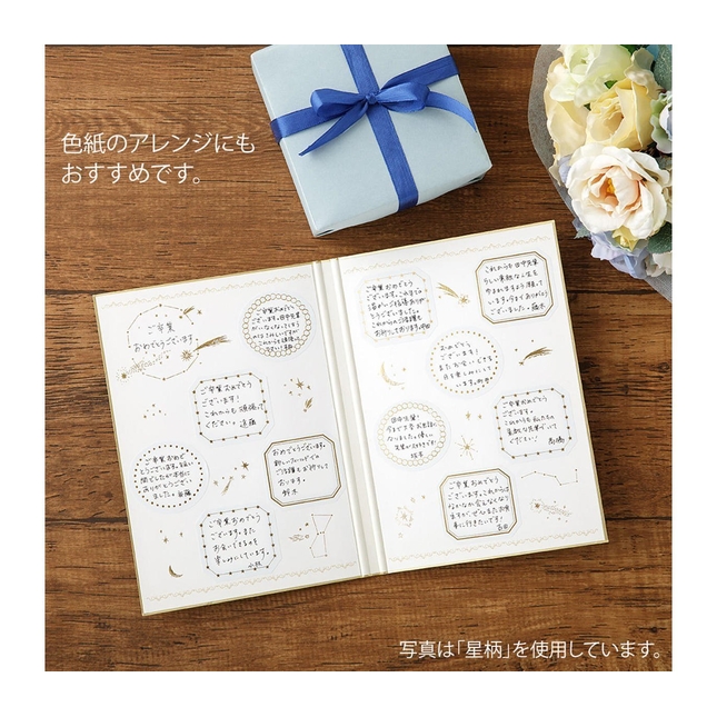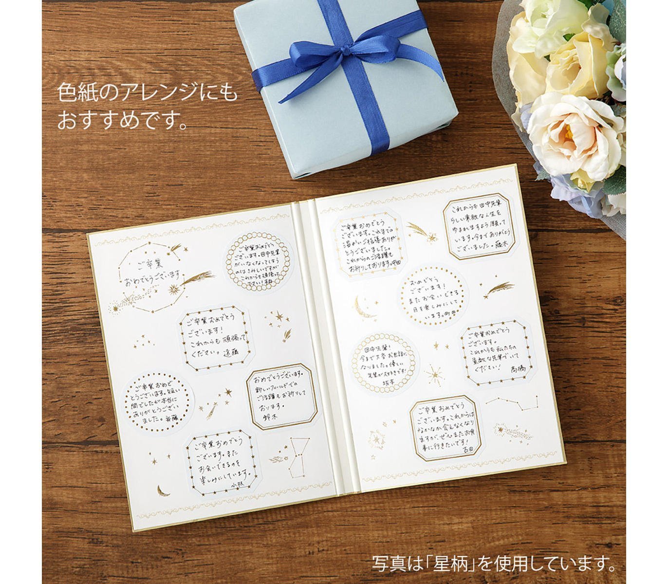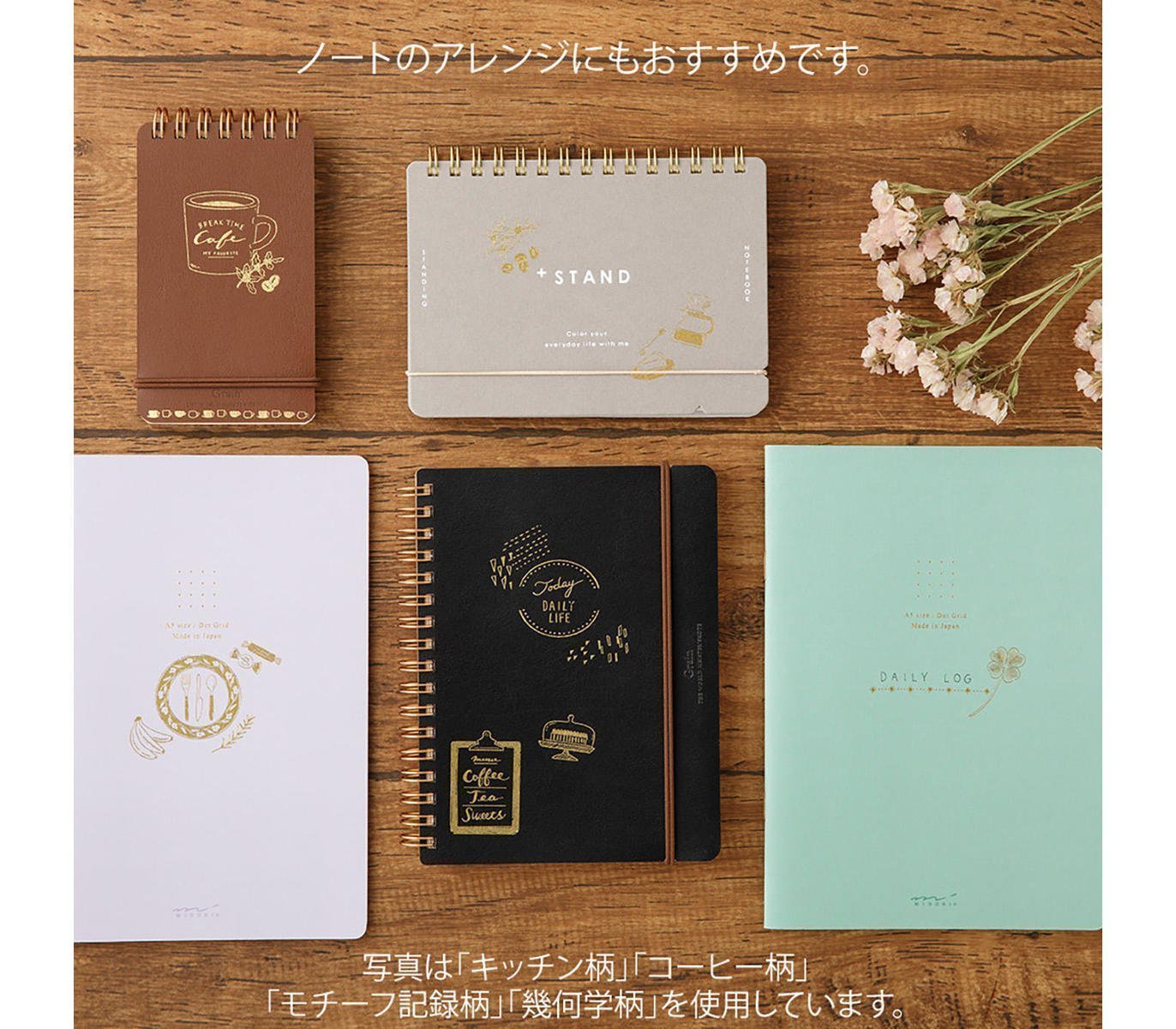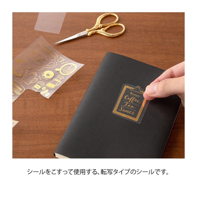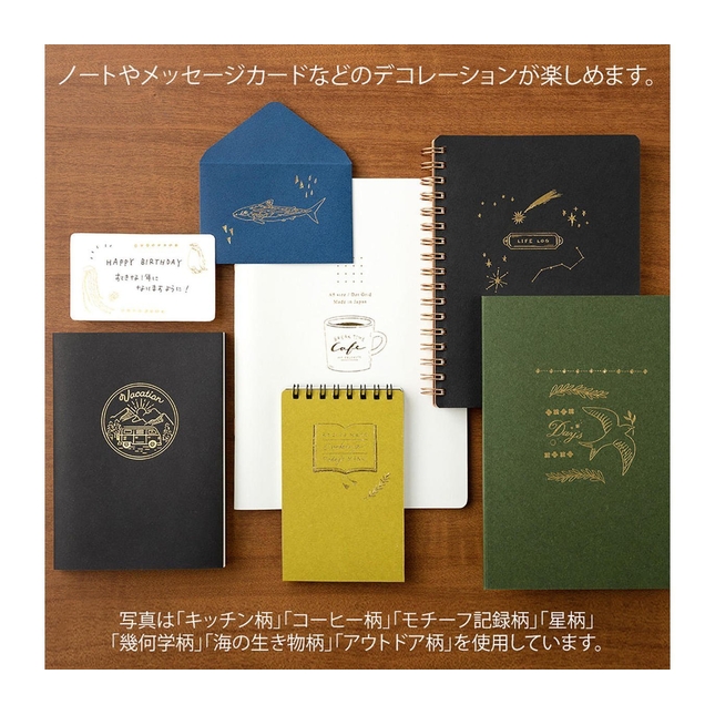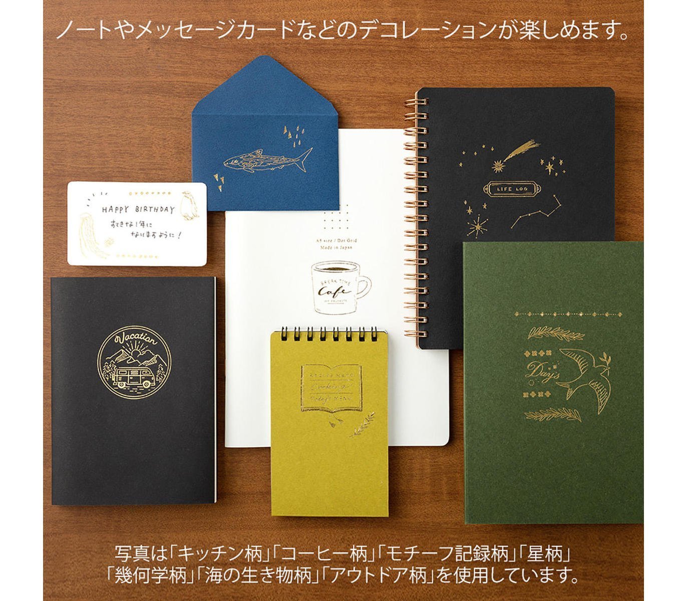 Midori Foil Transfer Sticker Adesivi Dorati Caffè è un set di adesivi (trasferelli) che possono essere utilizzati per creare decorazioni in lamina d'oro. Poiché non vengono creati rilievi, l'immagine è perfetta come se fosse stata stampata.