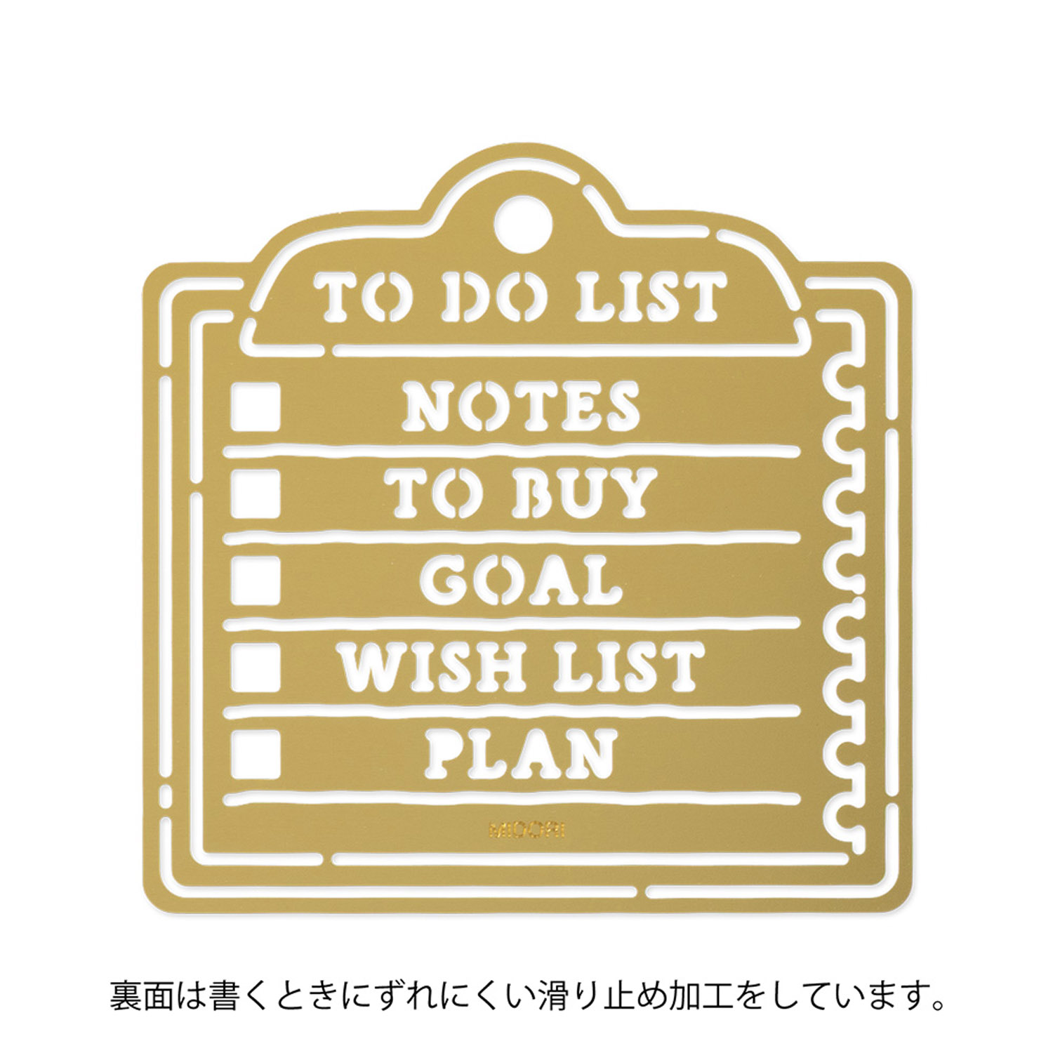 Stencil in ottone con icone memo e to-do list, pratico e compatto per organizzare e decorare diari e planner in modo creativo.