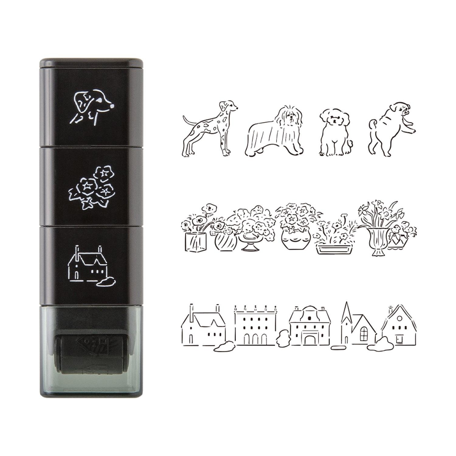 Timbro a rullo Midori Cani & Paesaggi con tre motivi continui: cagnolini, aiuola fiorita e casetta. Inchiostro integrato, 40 metri di utilizzo e ricaricabile.
