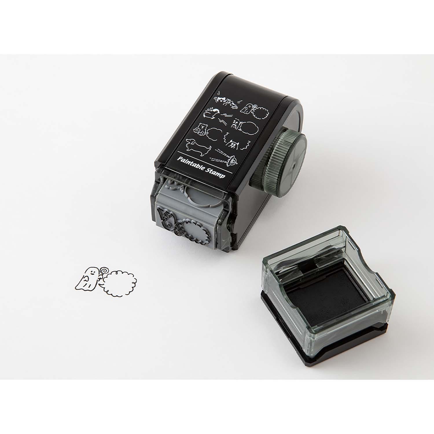 Timbro girevole Midori Speech Bubble con otto motivi a fumetto. Perfetto per messaggi e note creative. Impronta nitida, 1.000 utilizzi e inchiostro ricaricabile.